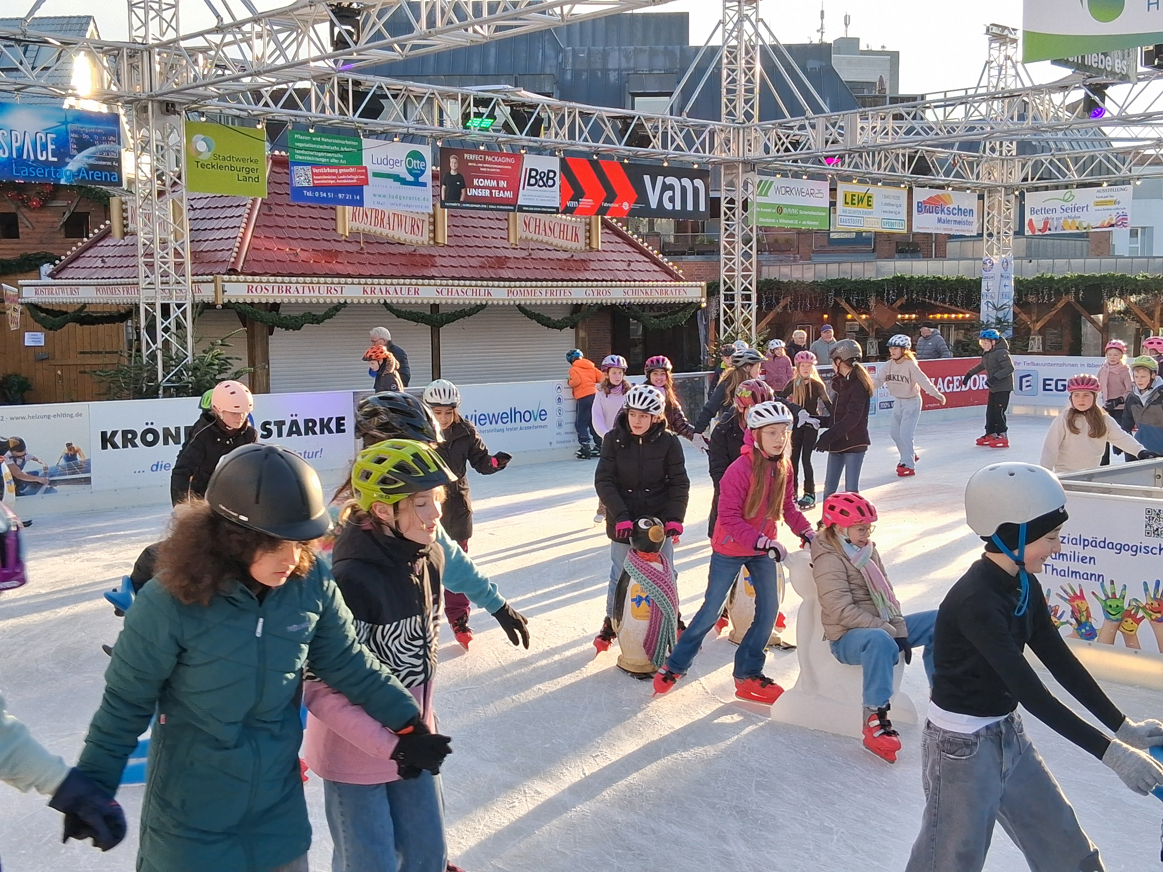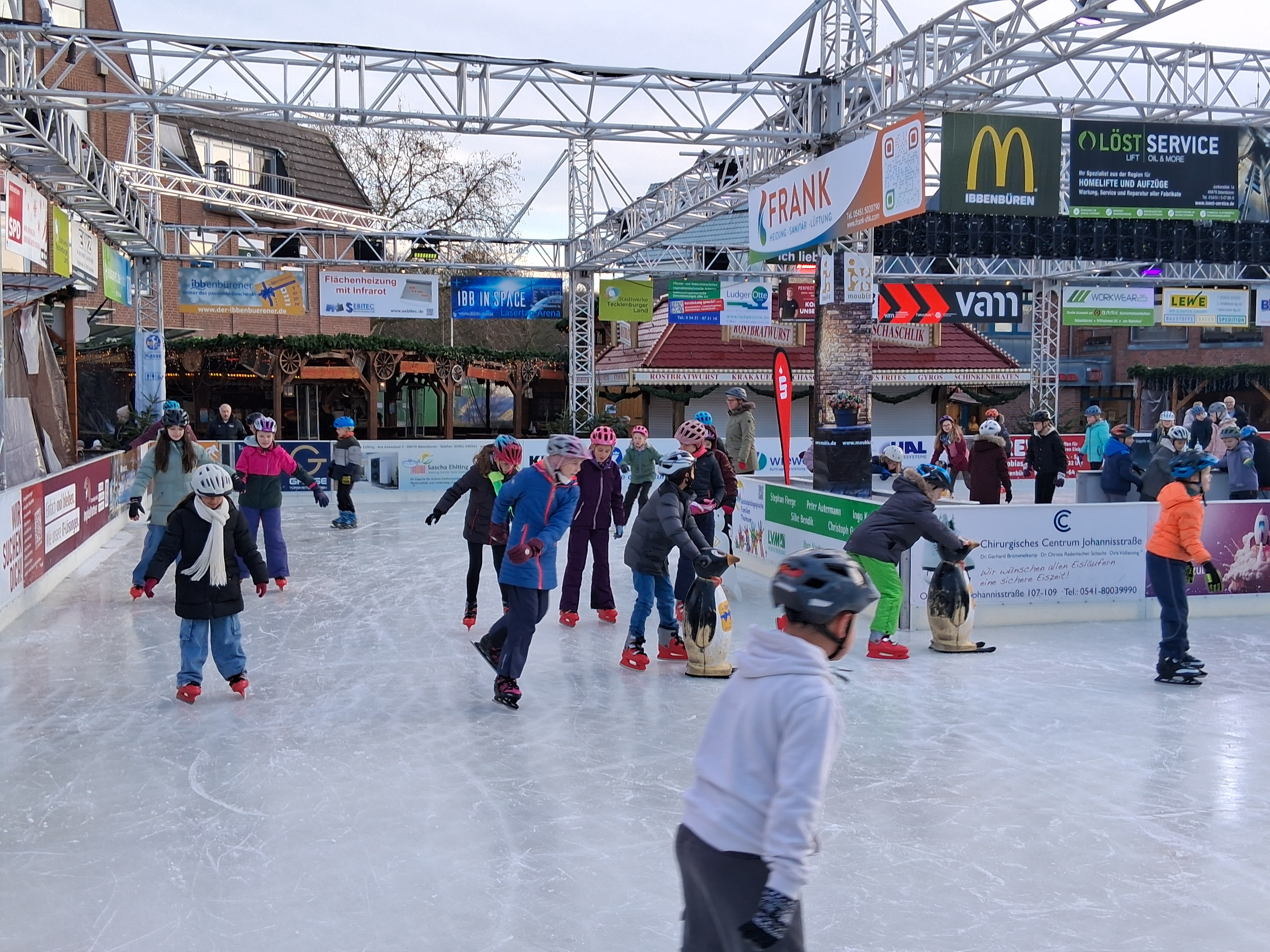 Mit dem Bus ging es zunächst vom GAG aus zur Haltestelle Bahnhof in Ibbenbüren. Von dort war es ein kleiner Spaziergang zum Ibbenbürener Neumarkt mit seiner Eislaufbahn und dem winterlichen Budendorf.