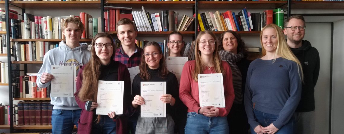 Das Zertifikat Cambridge English: Advanced als weltweit anerkannter Nachweis für Englischkenntnisse hat auch eine relativ hohe Durchfallquote. Umso erfreulicher war daher das tolle Abschneiden der Gruppe. Sprachtalent und Ehrgeiz gehören bei diesem Format ebenso dazu wie vorheriger Fleiß und eine gewisse Nervosität. Letztere erwies sich bei der sprachtalentierten Gruppe und der guten Vorbereitung als unbegründet. Zoe Blumenberg und Carina Schleiwies resümierten bei der Zertifikatsverleihung: „Es war wirklich eine Herausforderung, und wir freuen uns über dieses tolle Ergebnis der gesamten Gruppe“. Während des Vorbereitungskurses konnten die Schülerinnen und Schüler die Gelegenheit wahrnehmen, bewusst mehr Englisch zu sprechen, typische Redewendungen klug einzubauen und insgesamt mehr Sicherheit zu gewinnen.