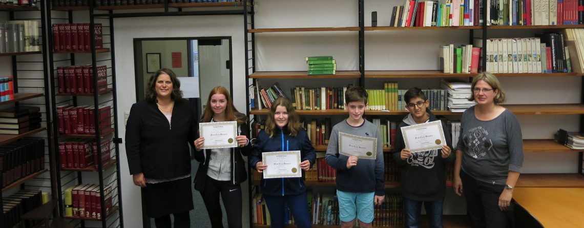 Das GAG nahm wieder sehr erfolgreich an dem bundesweit jährlich durchgeführten Englischwettbewerb The Big Challenge teil. Es ist ein Motivationswettbewerb, in dem Schülerinnen und Schüler der 5. bis 9. Jahrgangsstufen aller Schulformen ihre Englischkenntnisse auf spielerische Weise unter Beweis stellen und parallel auch verbessern können. Über 80 Schülerinnen und Schüler der Sekundarstufe I des Tecklenburger Gymnasiums nahmen die Herausforderung an, betreut durch Englischlehrerin Nicole Hoge. Fünf von ihnen erreichten im Bundesvergleich hervorragende Ergebnisse und erhielten im Juni dafür ihre Urkunden und Preise: Malin Wieschebrock (9b), Marie Rhode (7a), Philipp Schüller (6b), Arian Askari (5d) und Maru Klang, die am GAG die höchste Punktzahl errang, leider aber nicht auf dem Foto zu sehen ist.