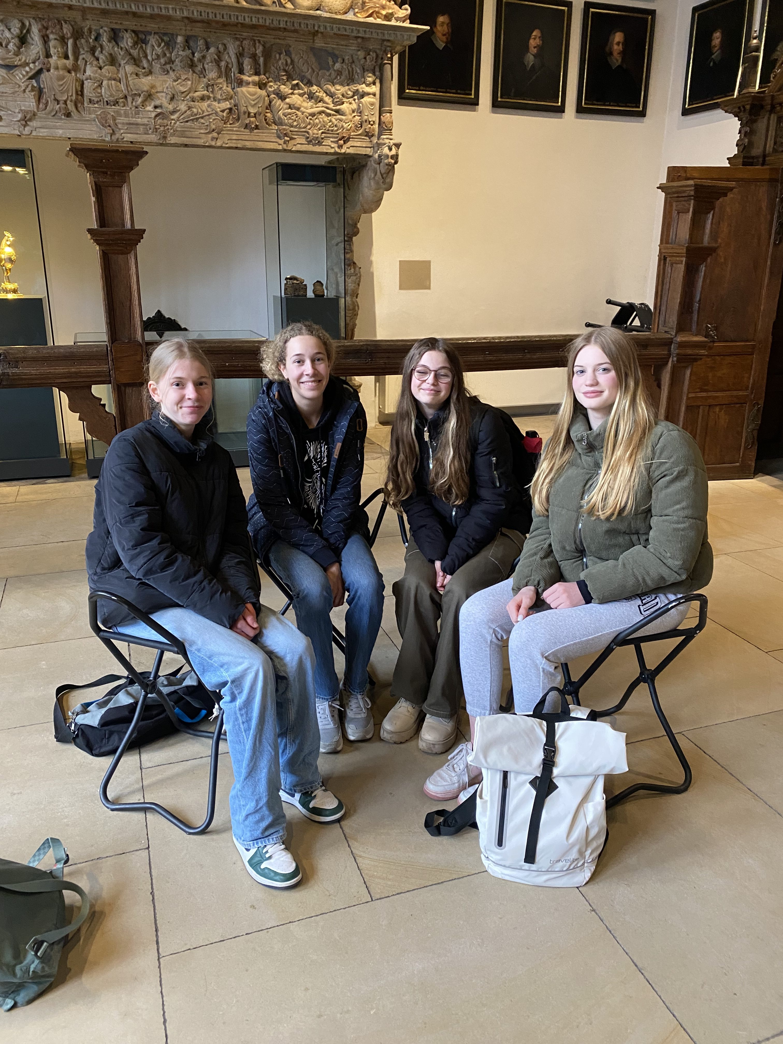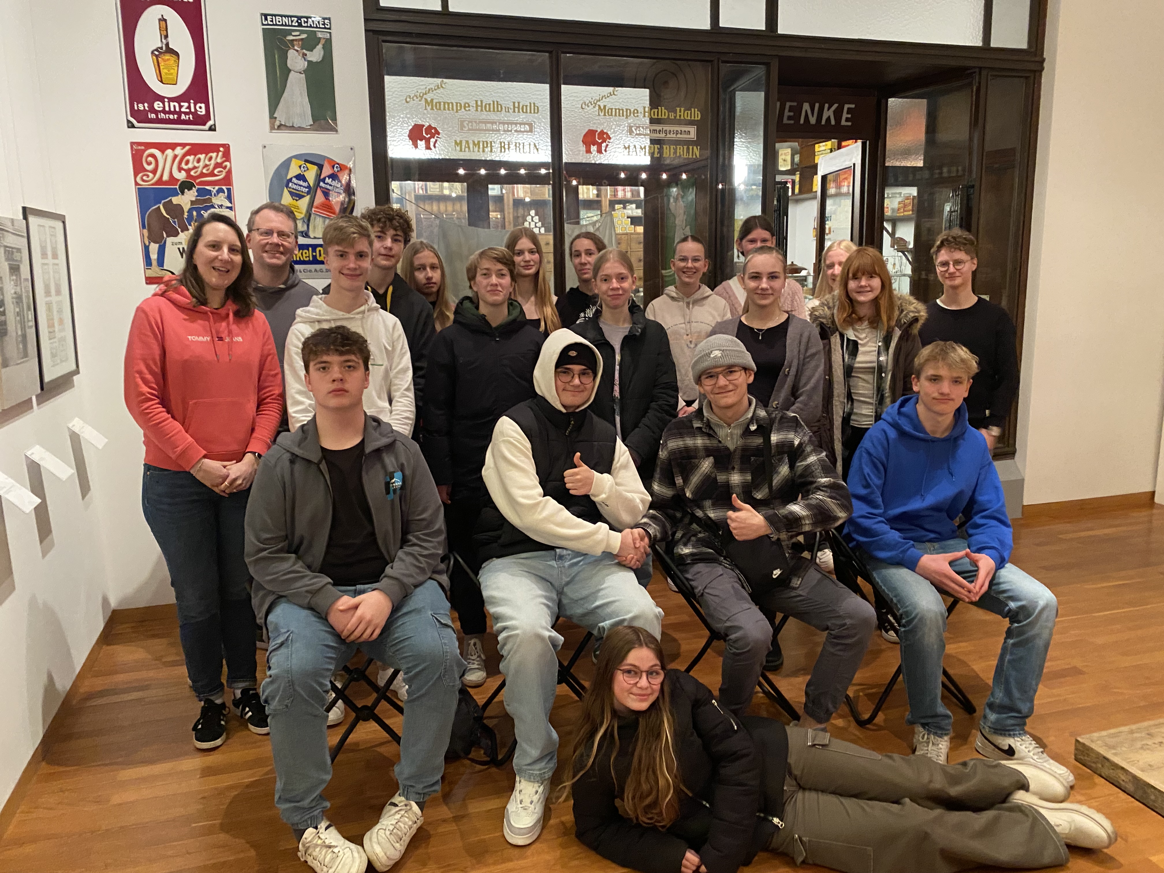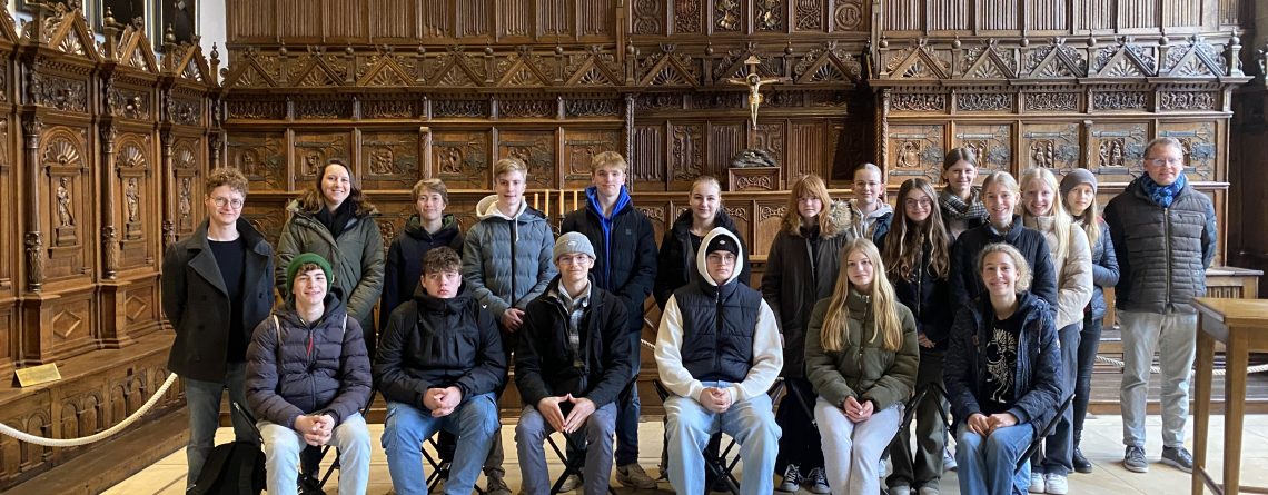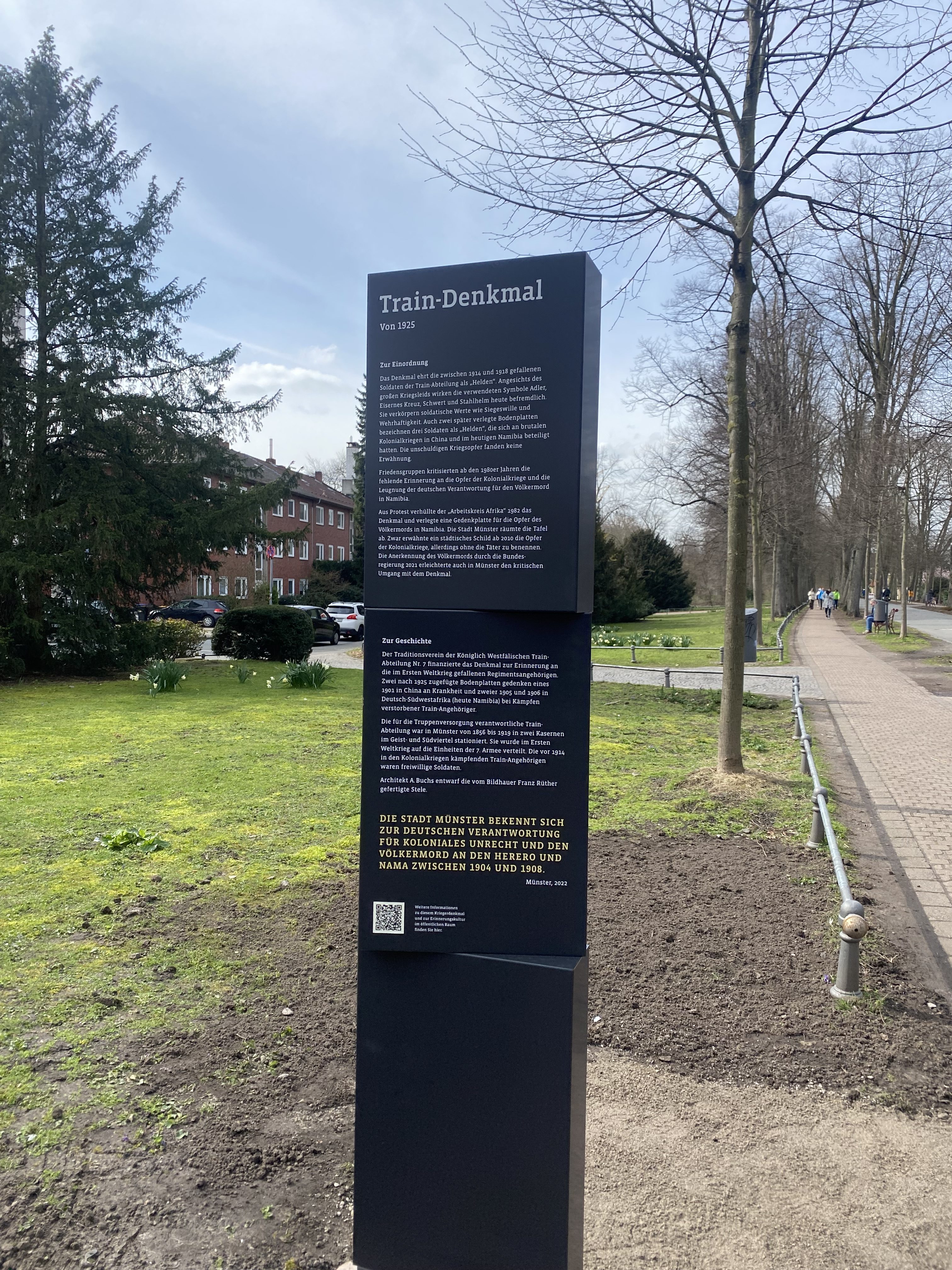 Am 28. März traf sich die Klasse 9a am Lengericher Bahnhof, um sich auf den Weg nach Münster im Rahmen einer Exkursion zu machen. Einige hochmotivierte Schüler*innen reisten mit dem Fahrrad nach Lengerich an, allerdings nur die etwas verrückten. Dann erlebten wir ein Wunder der DB, denn unsere Regionalbahn kam fast pünktlich. Die kurze Fahrt nach Münster verging wie im Flug. Angekommen am Bahnhof wurde als erster Programmpunkt eine kleine Frühstückspause eingelegt. Trotz einzelner Missachtungen der Verkehrsregeln kamen wir gut an der ersten Etappe unserer geschichtlichen Exkursion an. Pünktlich um 10 Uhr öffneten sich die Tore des Stadtmuseums und die Führung zum Dreißigjährigen Krieg konnte beginnen. Nach einer 45-minütigen eher langatmigen Führung einer Historikerin des Stadtmuseums folgte der spannende Teil: eine private Führung des geschichtlich versierten Herrn Sechelmann mit interessanten Einblicken in die Münsteraner Stadtgeschichte und einzelne Epochen. Im Anschluss bekamen wir die Möglichkeit, das Museum auf eigene Faust zu erkunden. Hierbei begeisterten uns insbesondere die bewegenden Abteilungen zum Ersten und Zweiten Weltkrieg. Gegen 12.30 Uhr setzten wir unsere Exkursion fort und machten Halt beim Haus der Niederlande (ein, wie wir gelernt haben, geschichtsträchtiger Ort des Dreißigjährigen Krieges). Angekommen im Rathaus, einem weiteren bedeutsamen Ort des Westfälischen Friedens, betraten wir den Friedenssaal. Die hier angebotene Führung war nicht altmodisch, sondern innovativ in Form eines Audio-Kommentars. Einzelne geschichtsmüde Schüler*innen nahmen für die Dauer der Präsentation Platz. Andere nutzten die Gunst der Stunde, um sich in das Gästebuch der Stadt Münster einzutragen und lasen mit Neugier die Einträge aus aller Welt. Alle bestaunten dennoch die verschiedenen Facetten und Besonderheiten des Friedenssaals. Nach diesem kurzweiligen Aufenthalt, welcher jedoch einen bleibenden Eindruck hinterließ, konnten wir eine einstündige Mittagspause in der Münsteraner Innenstadt verbringen. In Kleingruppen nahmen wir nicht nur Mittagessen zu uns, sondern begaben uns auch auf eine kleine Shoppingtour (beziehungsweise versuchten es ;-). Anschließend trafen wir uns an unserem nächsten Treffpunkt, damit dort Frau Bastine und Herr Südhoff ihr Versprechen einlösen konnten: “In Münster laden wir jede*n von euch auf zwei Kugeln Eis ein!”. Glücklich genossen wir unser wohlverdientes Eis. Hiernach verabschiedeten sich zwei Schüler, um die Sicherung eines zuvor gekauften Pullovers im Geschäft entfernen zu lassen. Der Rest machte sich zu Fuß auf, um den eigentlichen Anlass der Exkursion aufzusuchen: Über das Train-Denkmal hatten wir bereits in den Unterrichtsstunden zuvor ausführlich diskutiert und uns mit seiner Geschichte auseinandergesetzt. Es war interessant, sich mit einem viel diskutierten Thema zu beschäftigen, wozu wir uns nun durch den Eindruck des Denkmals live und in Farbe unser eigenes Bild machen konnten. Im Unterricht hatten wir bereits über den Umgang mit dem Denkmal diskutiert und waren überrascht zu sehen, dass einer unserer vielen Lösungsvorschläge in Form einer Stele, welche die Ereignisse erläutert, kürzlich verwirklicht worden war (siehe Foto). Hiernach begaben wir uns zum Bahnhof, von wo aus wir die Heimreise nach Lengerich bzw. Tecklenburg antraten. Abschließend lässt sich festhalten, dass die Exkursion eine tolle Möglichkeit bot, Inhalte aus dem Unterricht real zu erleben.