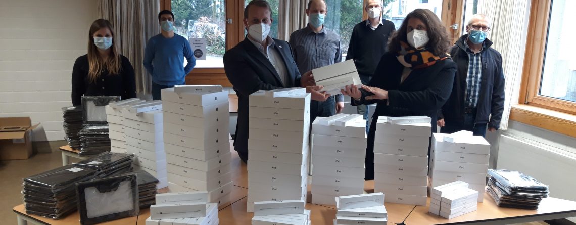 Die 80 I-Pads, die GAG-Schulleiterin Evelyn Futterknecht nun am Donnerstag (11. März 2021) hocherfreut entgegennahm, werden Schülerinnen und Schülern leihweise anvertraut, die über kein eigenes Endgerät verfügen. Außerdem kann in der Zukunft der flexible Restbestand bei Bedarf zur Ergänzung des innerschulischen Geräte-Pools für den Unterricht und für Projekte genutzt werden.