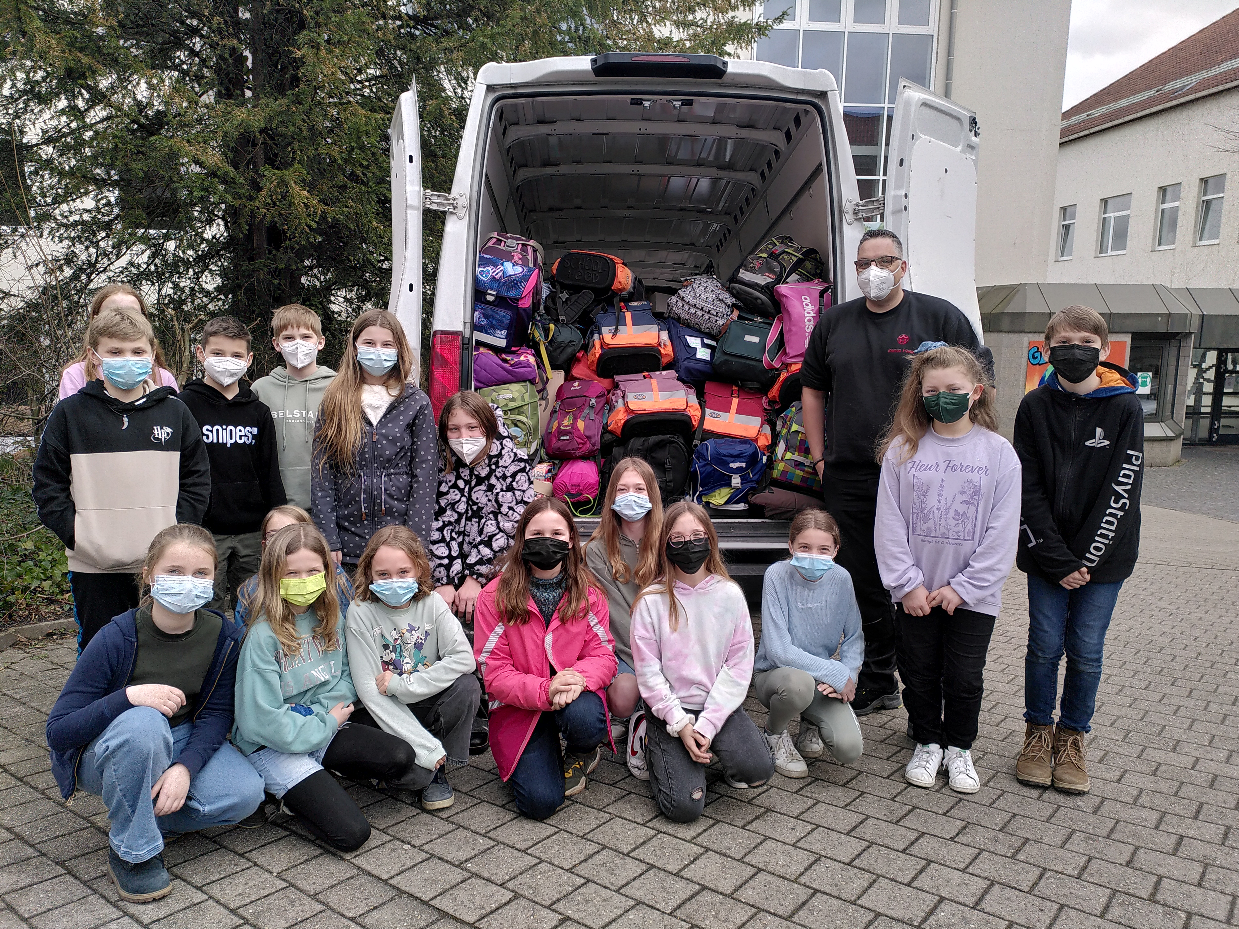 Nach der Lieferung der 100 prall gefüllten Schulrucksäcke, die sich am vergangenen Freitag auf den Weg in die Gemeinde Stara Kamienica gemacht hatte, folgten nun am Donnerstag weitere 170 zum Bersten gefüllte Schultaschen, die die Schulgemeinschaft des GAG sowie Tecklenburger Bürger*innen und Helfer*innen aus dem Umland großzügig gespendet hatten. Aus Gravenhorst erreichte zudem ein Pferdeanhänger voll von Hilfsgütern für die notleidenden Menschen in der Ukraine das GAG. Familie Hunsche hatte dort vierzig Kartons an wichtigen Hilfsgütern gesammelt und zum Graf-Adolf-Gymnasium gebracht.