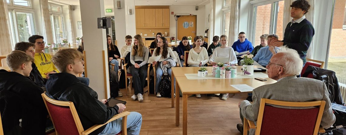 Eine Geschichtsstunde der anderen Art erlebten die Schülerinnen und Schüler der Klasse 10c am 18. April. Sie besuchten gemeinsam mit ihrem Lehrer Herrn Dr. Rüschenschmidt den ehemaligen Bürgermeister von Tecklenburg, Klaus Martin Lausberg – allerdings weniger wegen seiner politischen Verdienste, sondern um über seine Kindheit und Jugend im Nationalsozialismus und der Nachkriegszeit zu sprechen.