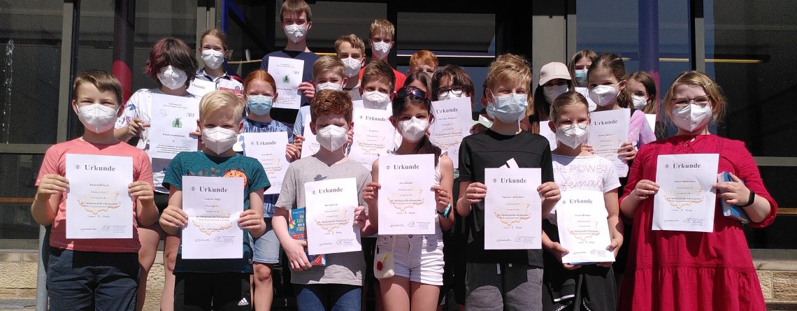 Auch die Preis- und Urkundenverleihung fand in diesem Jahr dezentral an den Schulen statt. Und so überreichte Schulleiterin Evelyn Futterknecht Ende letzter Woche die Preise und Urkunden auf dem Schulhof. Sie freute sich sehr über ihre GAG-Mathetalente und übergab allen daher auch noch zusätzlich eine Urkunde zur schulinterner Anerkennung ihrer Leistungen.