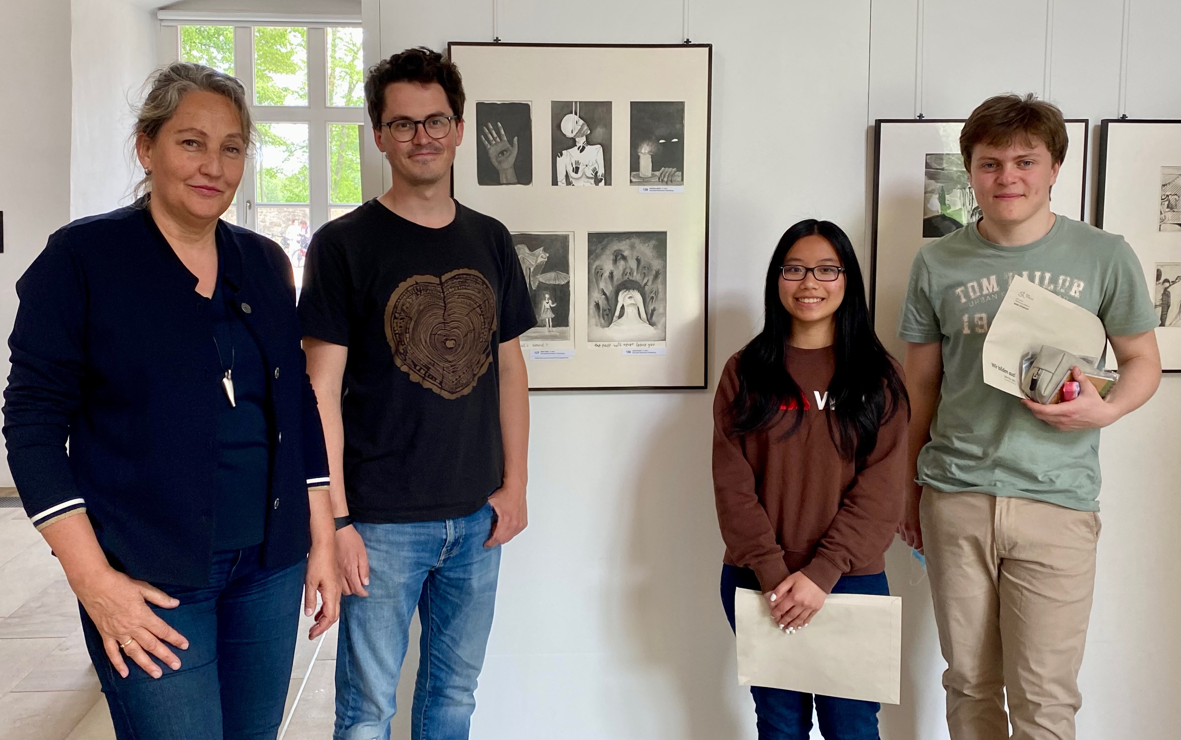 Zwei Lernende des Kurses, Minh Tran und Dionis Musaj, wurden auch als Preisträger geehrt. Der Kurs unter der Leitung von Thorsten Kracht hatte eine Grafikmappe mit Tuschezeichnungen eingereicht, aus der von der Jury insgesamt sieben Arbeiten von Minh und Dionis sowie Luca Utlaut und Vanessa Herdt für die Ausstellung ausgewählt wurden. Die Jugendlichen setzten sich dabei in Anlehnung an die Radierzyklen Francisco de Goyas und die Tuschezeichnungen Rembrandts mit dem Thema „Albträume unserer Zeit“ auseinander. Inhaltlich fanden sie hier sehr individuelle Zugänge und auch in zeichnerisch-technischer Manier freie, sehr gelungene Ansätze.