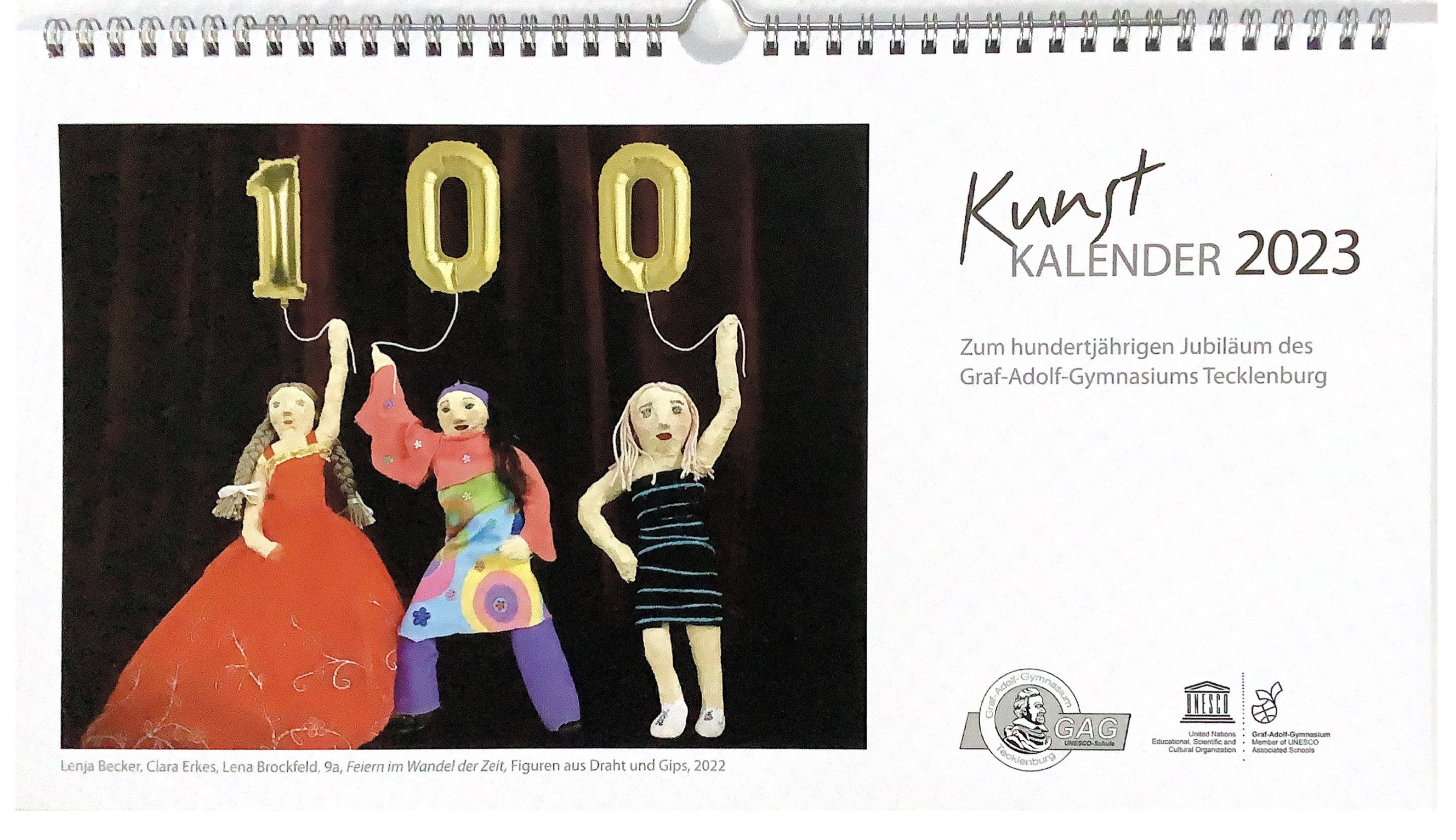 Die Kunstfachschaft freut sich sehr zum hundertjährigen Jubiläumsjahr 2023 des Graf-Adolf-Gymnasiums wieder einen Kunst-Kalender mit Arbeiten aus dem Unterricht beinahe aller Klassen herausgeben zu können! Die Motivpalette reicht hier von sehr differenzierten Zeichnungen, Acryl- und Gouachebilder, die die Schule und das Schulleben dokumentieren, über ausgefeilte Tuschearbeiten bis hin zu gesellschaftskritischen plakativen Drucken zu aktuellen Krisenthemen.