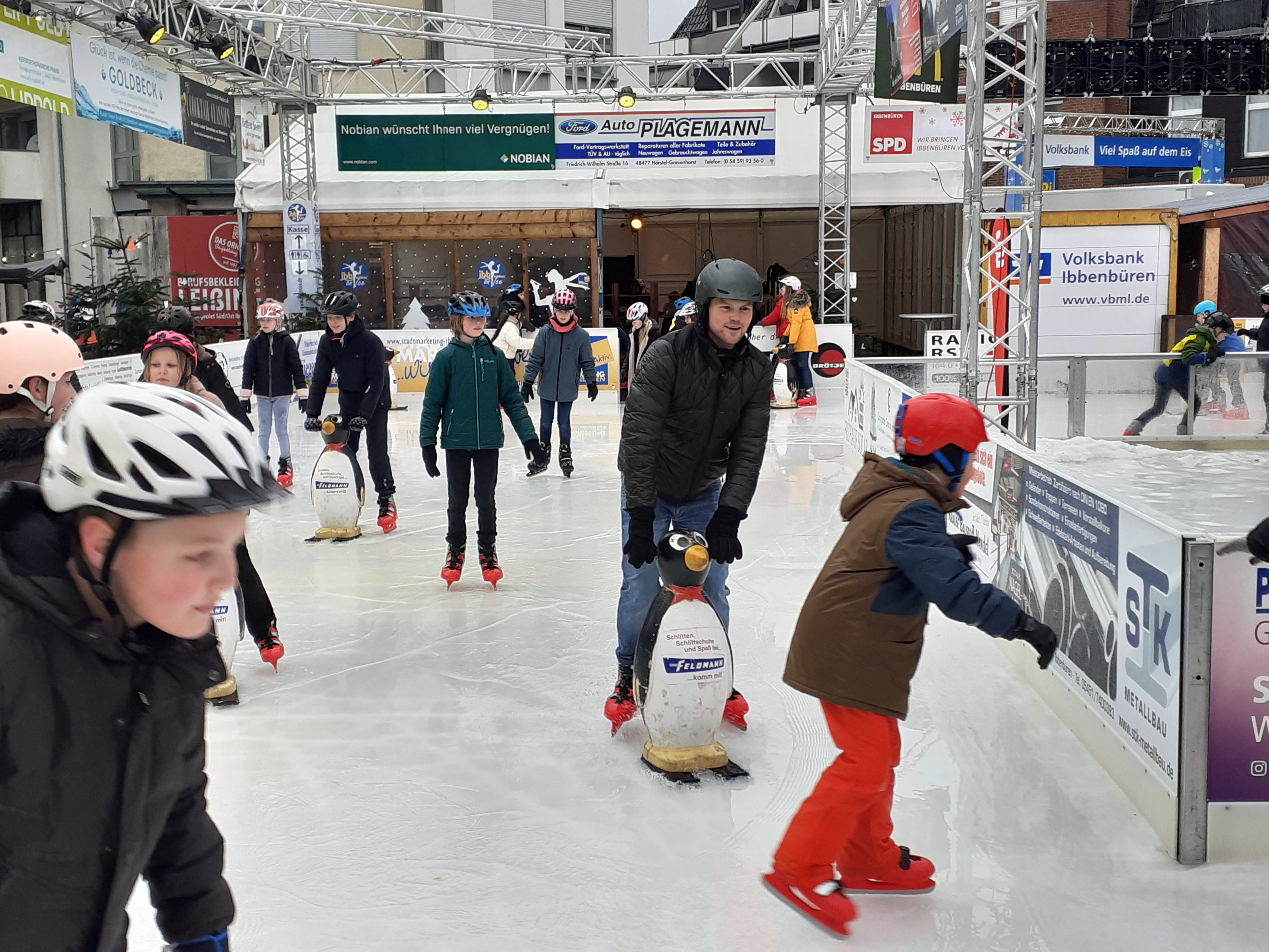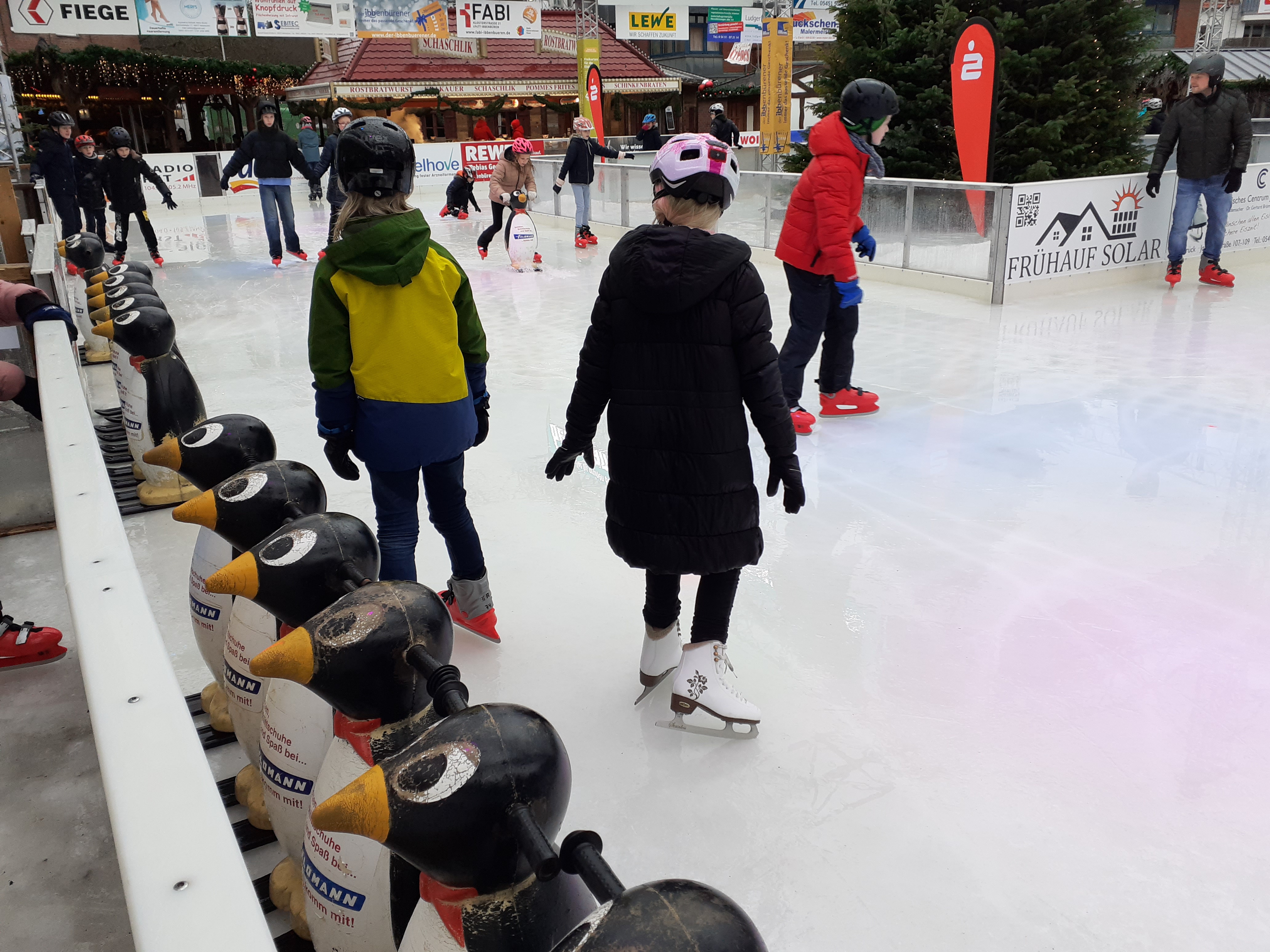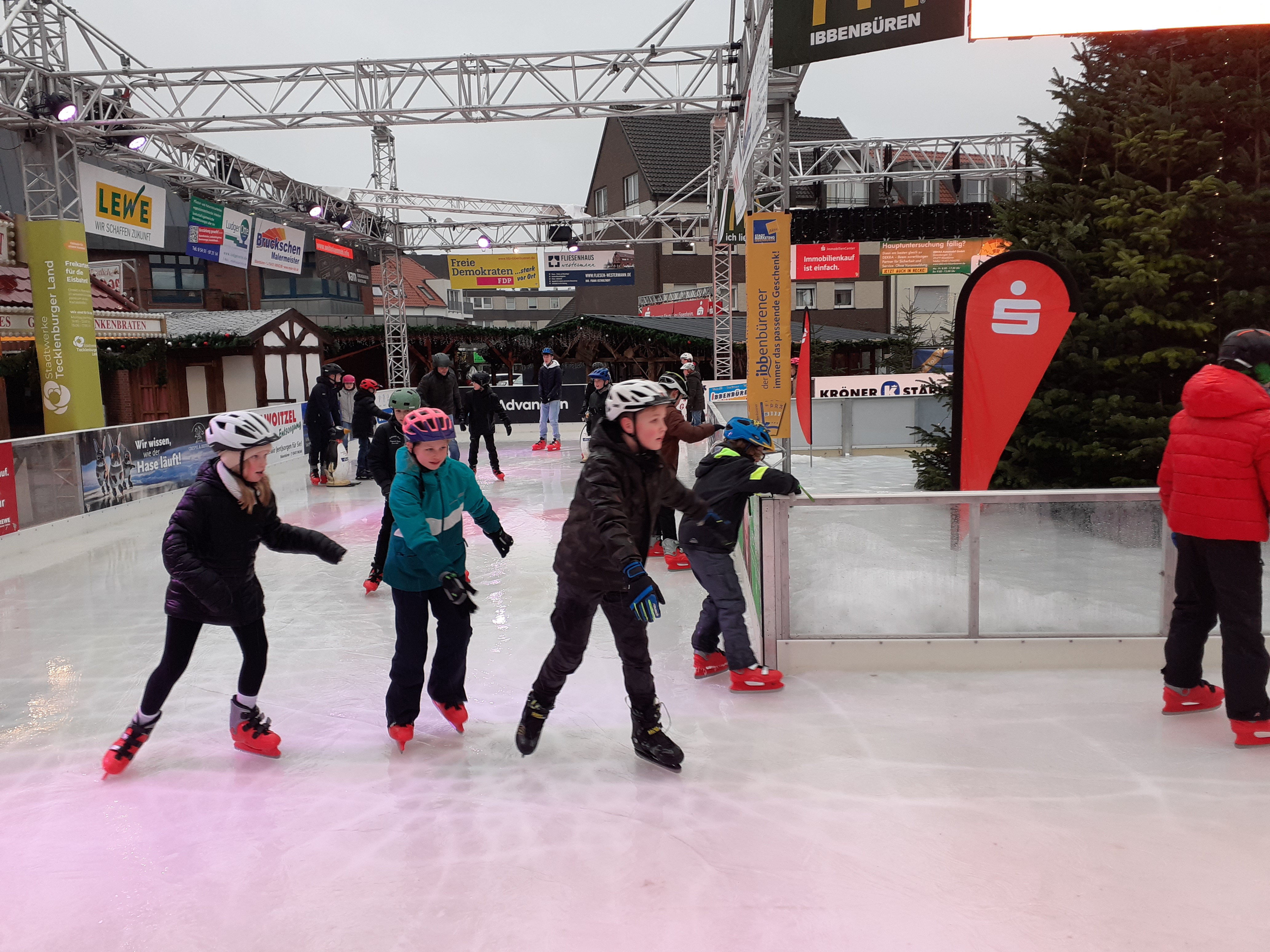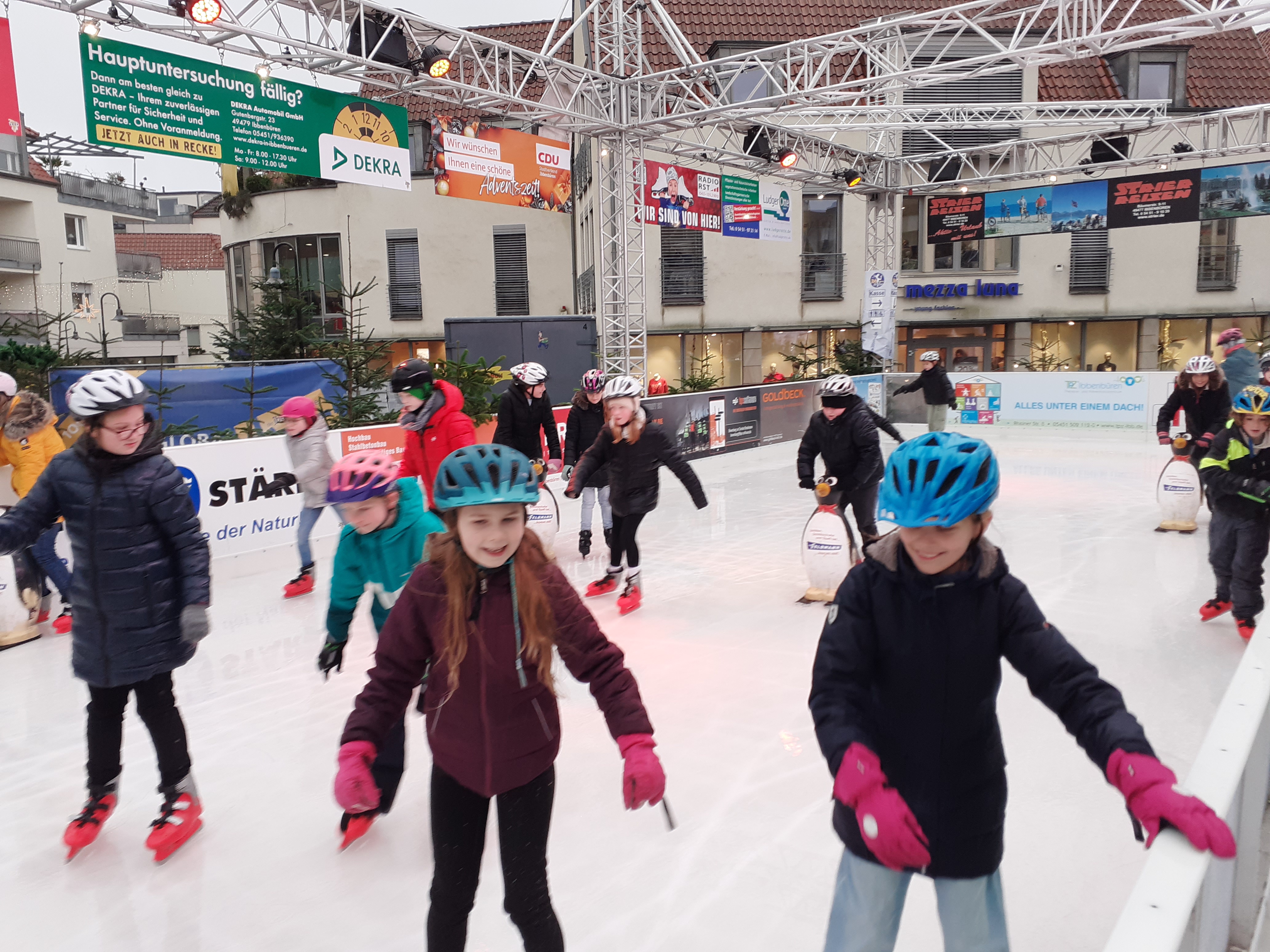 Mit dem klimafreundlichen Deutschlandticket und der Buslinie R45 ging es zunächst vom GAG aus mit dem Bus zur Haltestelle Bahnhof in Ibbenbüren. Von dort war es ein kleiner Spaziergang zum Ibbenbürener Neumarkt mit seiner Eislaufbahn und dem winterlichen Budendorf.