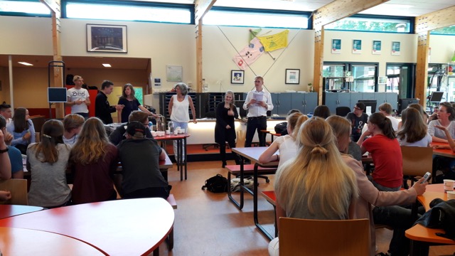 Es gab ein herzliches „Hallo“ oder mehr ein „hello“ und man freute sich über die vielen bekannten Gesichter. Nachdem die Koffer erst einmal verstaut waren verbrachten wir den Nachmittag mit Kuchen essen und interessanten Präsentationen über die Niederlande, Holten und die Schule.