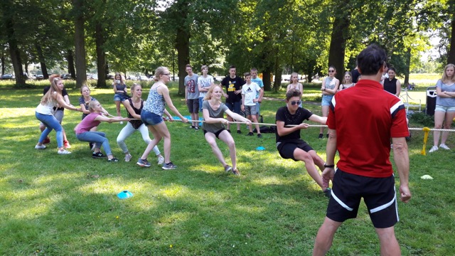 Weiter ging es mit dem Sportprogramm im nahe gelegenen Park. Einem kurzen Spaziergang über die IJssel-Brücke und dem obligatorischen Gruppenfoto folgte der Wettkampf in den Disziplinen Fußball, Bounceball und Frisbee. Wer Bounceball nicht kennt, dem sei gesagt es handelt sich hier um ein Spiel mit übergroßen Wattestäbchen mit denen auf einen kleinen Ball eingeschlagen wird um diesen ins gegnerische Tor zu befördern. Nach harten Kämpfen und einer Abkühlung mit Eis endete dieser Programmpunkt mit einem Tauziehen zwischen den Gruppen. Danach gab es noch ein wenig Freizeit in Deventer.