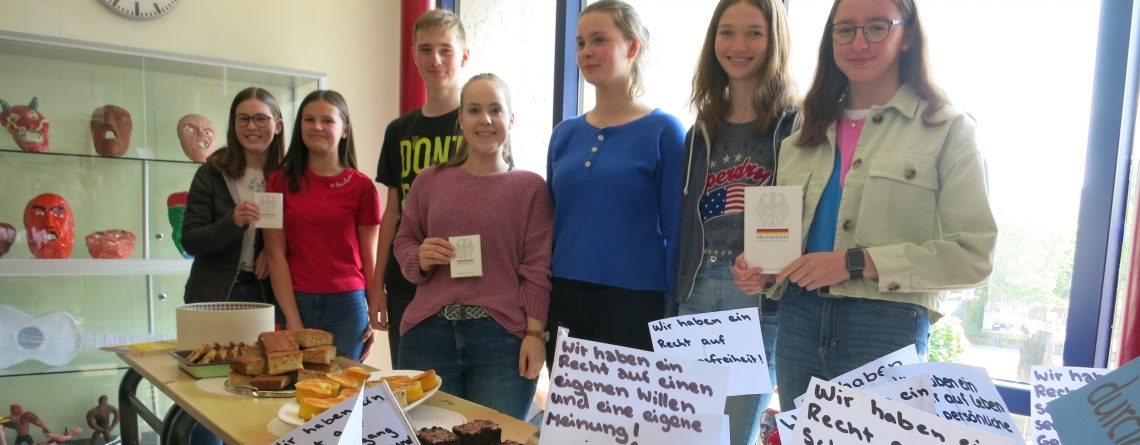 Die Feier anlässlich des 70. Geburtstags des Deutschen Grundgesetzes am Graf-Adolf-Gymnasiums begann in der ersten großen Pause mit einem Ständchen der Klasse 5b durch die Schulmikrofonanlage. „Happy Birthday, liebes Grundgesetz!“ sangen die Schülerinnen und Schüler voller Überzeugung und wollten damit noch einmal an die besondere Errungenschaft unserer Verfassungsgeberinnen und Verfassungsgeber erinnern. Zuvor hatten sie sich im Politikunterricht mit der im Koalitionsvertrag der Bundesregierung vorgeschlagenen Maßnahme zur Übernahme der Kinderrechtskonvention in das Grundgesetz befasst. Die vierzig Jahre nach der Verlesung des Grundgesetzes im November 1989 von fast allen Staaten der Welt vertraglich beschlossene Kinderrechtskonvention, in der Kinderrechte besondere Beachtung finden, traf bei den Fünftklässlerinnen und Fünftklässlern auf große Begeisterung. Dass ein Kind seitdem neben dem Anspruch auf Bildung, elterliche Fürsorge und gewaltfreie Erziehung auch ein Recht auf Freizeit, Spielen und Erholung hat, begrüßte die Klasse 5b sehr. In Form von Standbildern erzählten sie kurze Geschichten zu den verschiedenen Kinderrechten, sodass die Mitschülerinnen und Mitschüler erraten konnten, um welches Recht es sich handelte. In der zweiten Pause wurde zur Feier des Tages von Schülerinnen und Schülern eines Sozialwissenschaftskurses selbst gebackener Geburtstagskuchen für einen guten Zweck verkauft: Damit die im Grundgesetz für uns verbürgten Menschenrechte auch immer mehr weltweit zum Tragen kommen, setzten die Schülerinnen und Schüler den Erlös als Spende für Amnesty International ein, nachdem sie zuvor das Grundgesetz studiert und die Grundrechte mit den in der Menschenrechtscharta verfassten Menschenrechten verglichen hatten und besonders große Ähnlichkeiten feststellen konnten. Nach der Feier dieses ehrwürdigen Älterwerdens und der vorherigen Beschäftigung mit dem Grundgesetz und der Kinderrechtskonvention sind sich alle einig: Die im Koalitionsvertrag veranschlagte Übernahme der Kinderrechtskonvention in das Grundgesetz wäre ein angemessenes Geburtstagsgeschenk zum Siebzigsten.