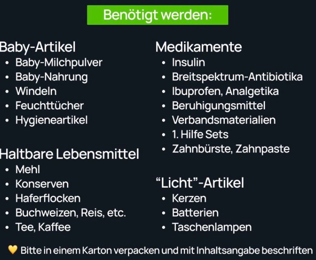 Gespendet werden können Sachgüter sowie finanzielle Beträge. Benötigt werden immer noch vor allem Babynahrung, Babybedarf, Hygieneartikel, medizinische Produkte, Decken, Kleidung und Lebensmittel.