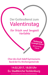 Zu einem Gottesdienst für Frisch- und Langzeit-Verliebte lädt die Ev. Kirchengemeinde Tecklenburg am Valentinstag (14. Februar) um 18.00 Uhr ein. „Es soll ein ganz besonderer Gottesdienst werden“ verspricht Pfarrer Björn Thiel: „Die Paare können sich segnen lassen und wir verlosen ein Candlelight Dinner“. Musikalisch gestaltet wird der Gottesdienst von der Band der Gemeinde und dem Chor des Graf-Adolf-Gymnasiums Tecklenburg. Der Gottesdienst findet in der Ev. Stadtkirche Tecklenburg, Kirchpfad 1, statt.