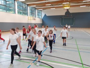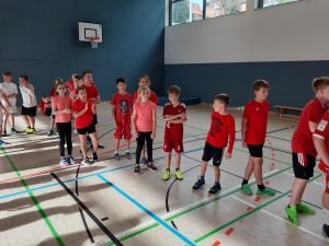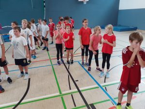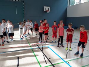 Nach einem Aufwärmprogramm durch die Patenschülerinnen und -schüler stand im ersten Block eine Biathlon-Staffel auf dem Programm. Dabei waren die Teilnehmerinnen und Teilnehmer der Parallelklassen gut von einander zu unterscheiden, da die 5a schwarze, die 5b weiße und die 5c rote Oberteile trugen. Sie feuerten sich gegenseitig an und hatten kreative Klassenschilder dabei.