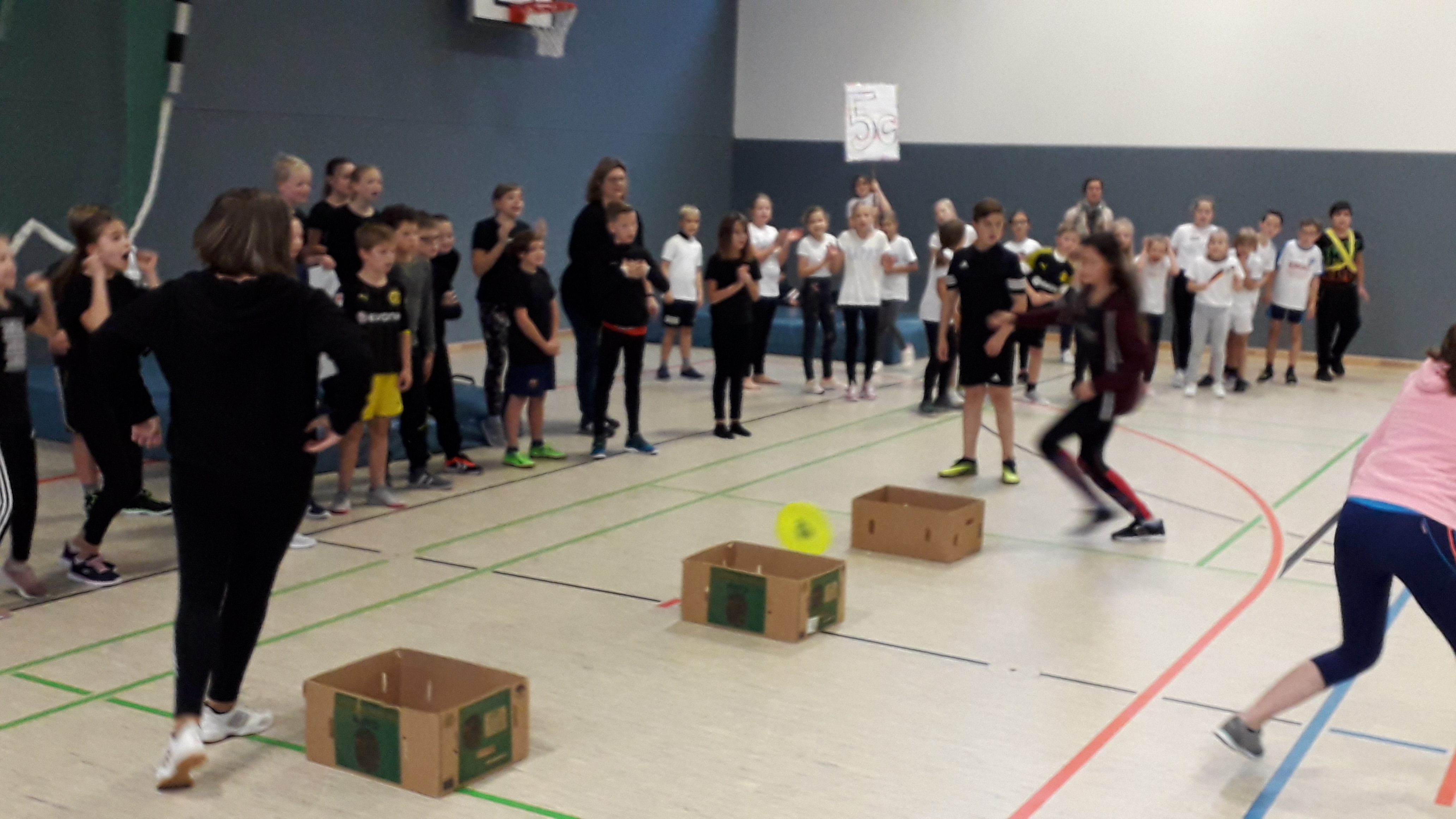 Nach einem Aufwärmprogramm durch die Patenschülerinnen und -schüler stand im ersten Block eine Biathlon-Staffel auf dem Programm. Dabei waren die Teilnehmerinnen und Teilnehmer der Parallelklassen gut von einander zu unterscheiden, da die 5a rote, die 5b schwarze und die 5c weiße Oberteile trugen. Sie feuerten sich gegenseitig an und hatten kreative Klassenschilder dabei.