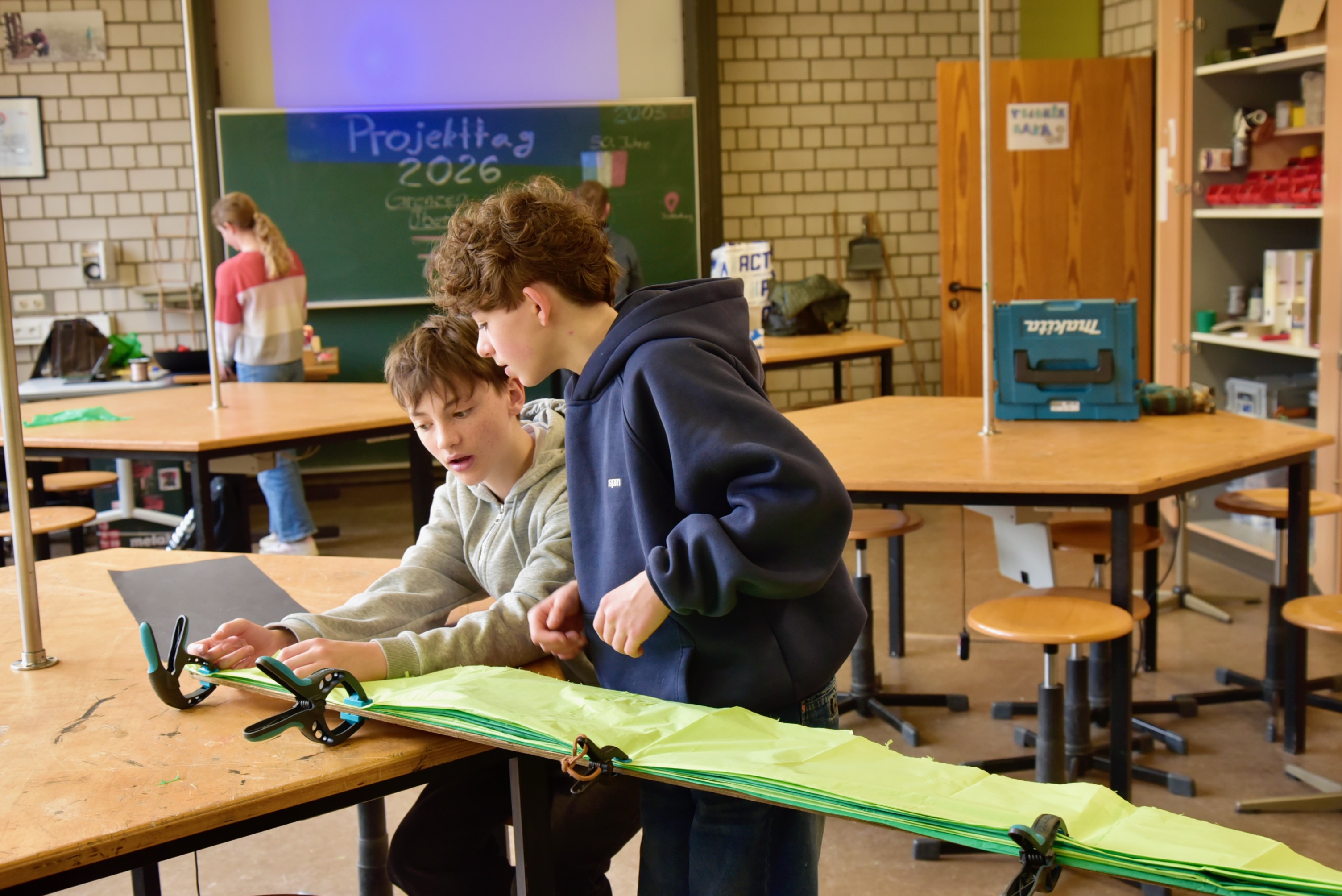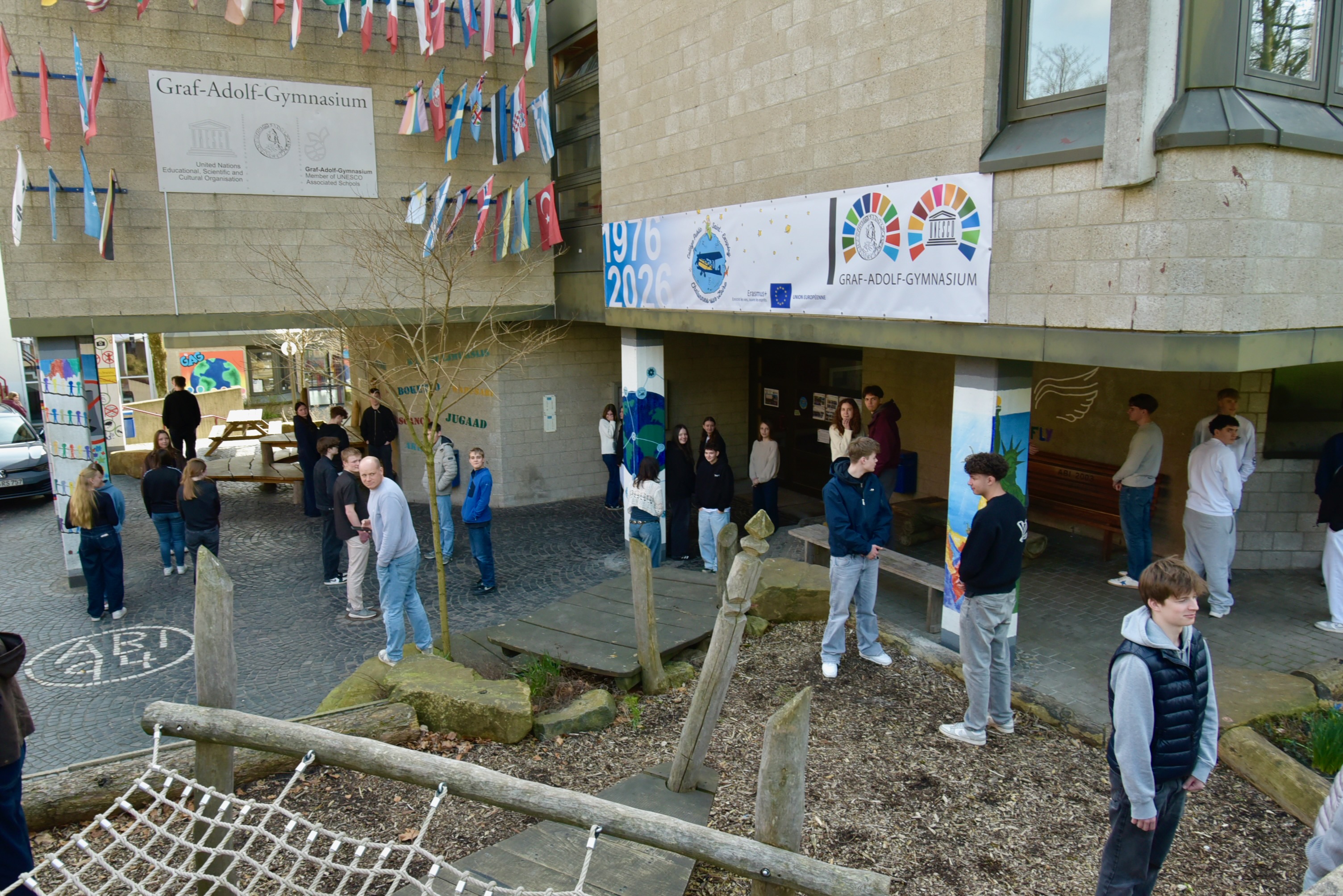 Auf einen nicht nur aus einer Feierstunde bestehenden Jubiläums-Festtag am Freitag, den 20. März hatten sich am GAG im Frühjahr 2026 schon langfristig die Vorbereitungen konzentriert, und man war sich einig, dass ein Rahmen, der allen Lernenden Gelegenheit zur bewussten Mitarbeit geben konnte, am passendsten durch die Vorausnahme des UNESCO-Projekttags geschehen konnte, mit dessen vielsagendem Motto „Grenzen überwinden“. Das GAG als UNESCO-Schule nutzte das diesjährige Thema des weltweiten Netzwerks als einen stimmigen Rahmen, um in allen Lerngruppen Projekte und mit einem breiten Fächerkanon zu planen, die am Vormittag vorgestellt wurden. Mit einem bunt gefächerten Potpourri an Gestaltung, Forschung und Aktion startete man vormittags gemeinsam mit der Chalonner Gastgruppe und Gästen aus beiden Ländern, indem man die Projekte der heutigen Lernenden ausgiebig würdigte. Dazu gehörte aber auch, dass eine Aufstellung aller Ehemaligen Austauschgruppen durch die Französisch-Fachschaft vervollständigt wurde.