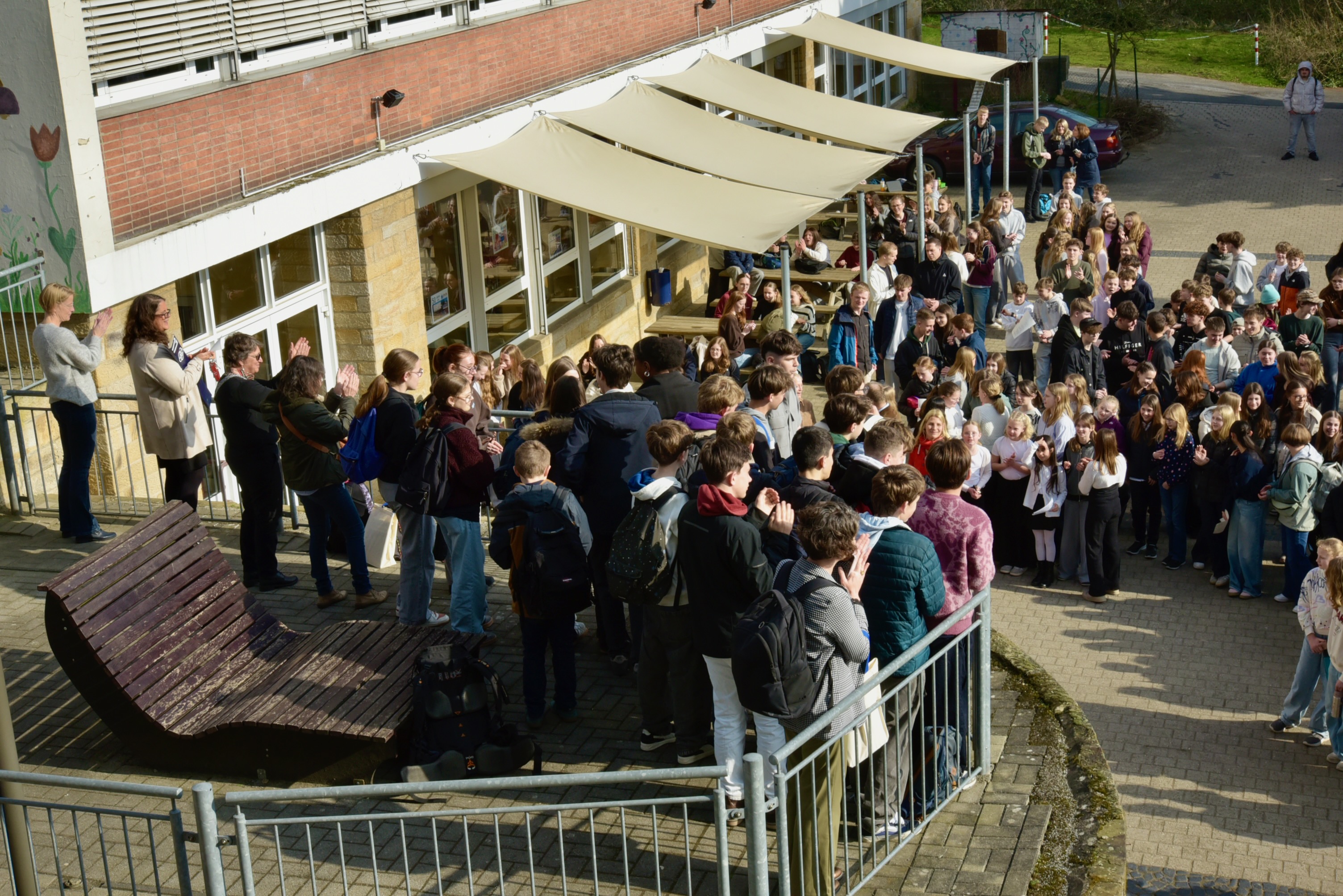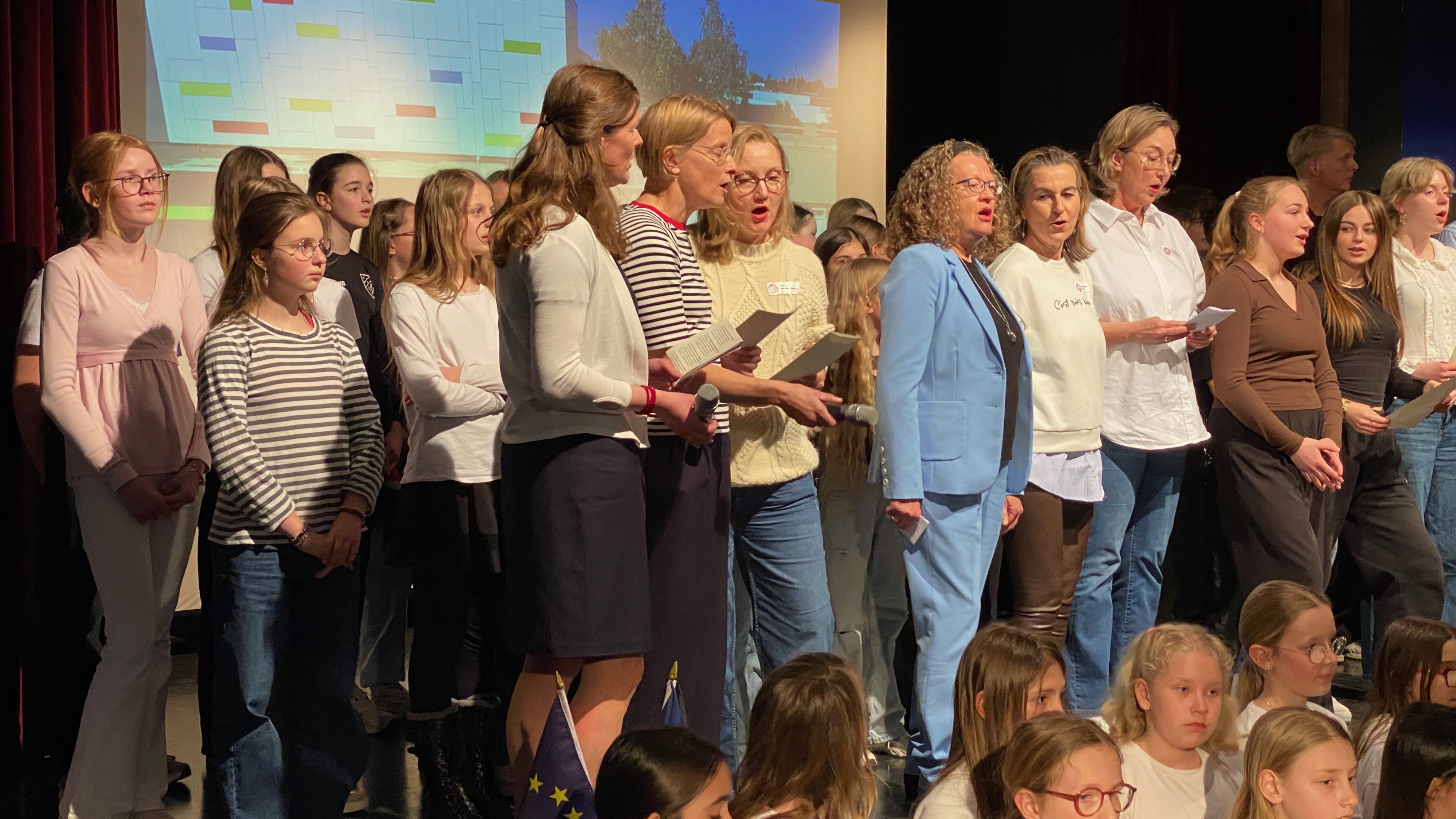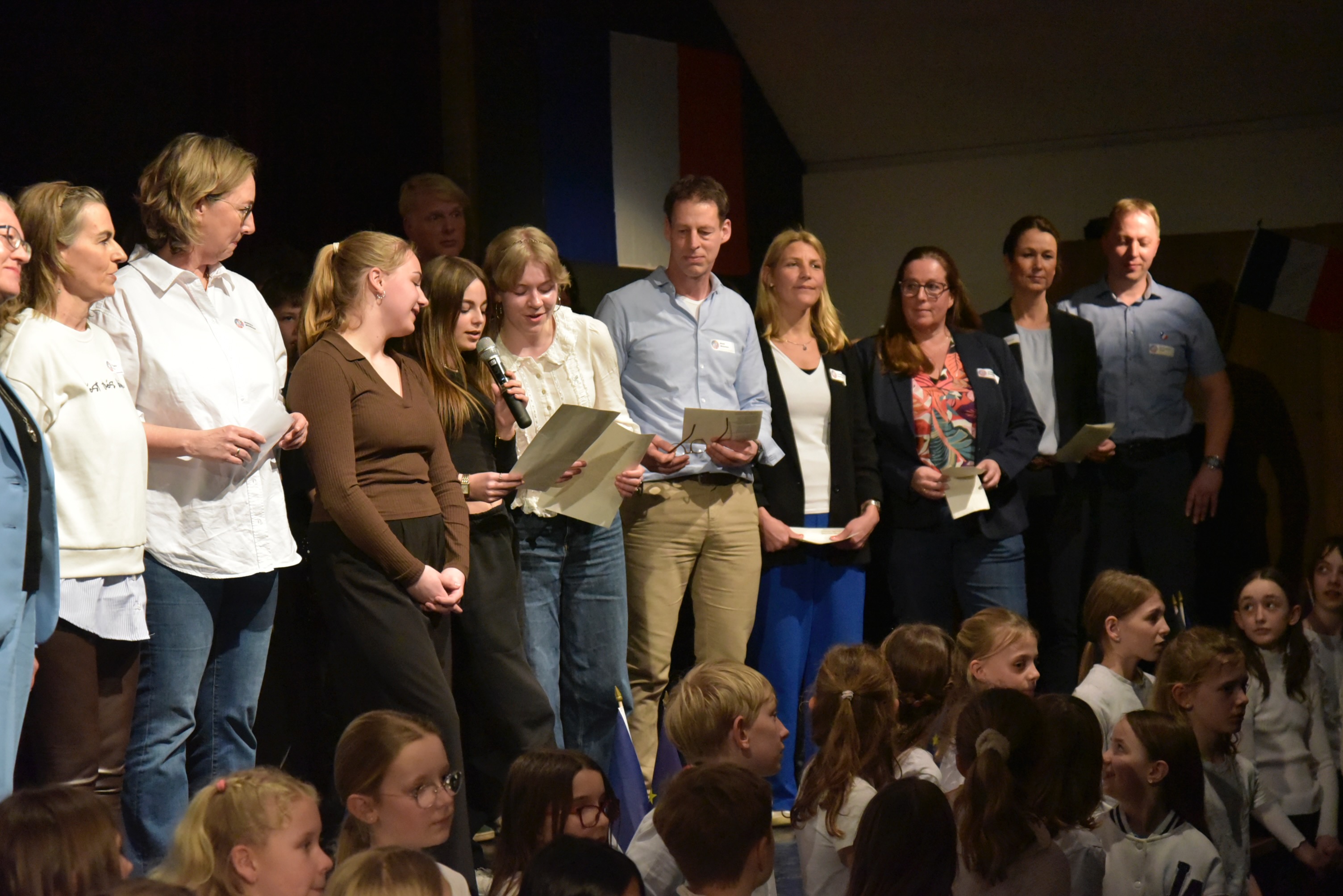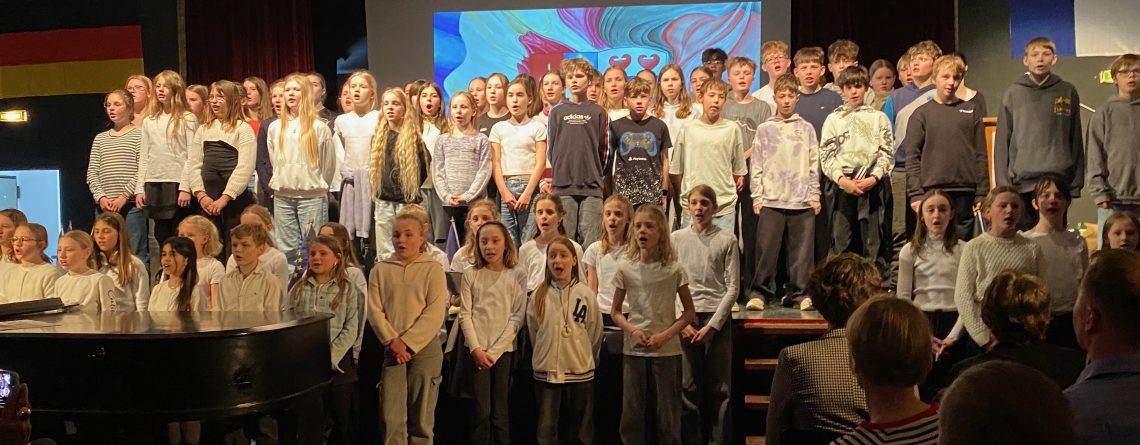 Mit einem grandiosen musikalischen „Flashmob“ überraschte die GAG-Schulgemeinschaft am Freitagvormittag (20. März 2026) ihre französischen Gäste, eine 11-köpfige Gruppe Deutschlernender des Collège. Alle Klassen und Lerngruppen hatten sich versammelt und das in den letzten Wochen einstudierte mittlerweile schon zur „Hymne des Austauschs“ gewordene Lied „A Chalonnes „(nach der Melodie von „Oh, Champs Èlysées“) angestimmt. Außerdem erschuf die Idee, bekannte französische Melodien in das Festprogramm einzubetten, auch beim Festakt am Freitagabend (20. März) viel Frankreich-Flair: Sowohl die von Musiklehrer Simon Zafiraris geleiteten vokalpraktischen Kurse als auch ein von ihm am Klavier begleiteter Lehrkräfte-SchülerInnen-Chor intonierten bekannte französische Titel (siehe weiter unten: …)