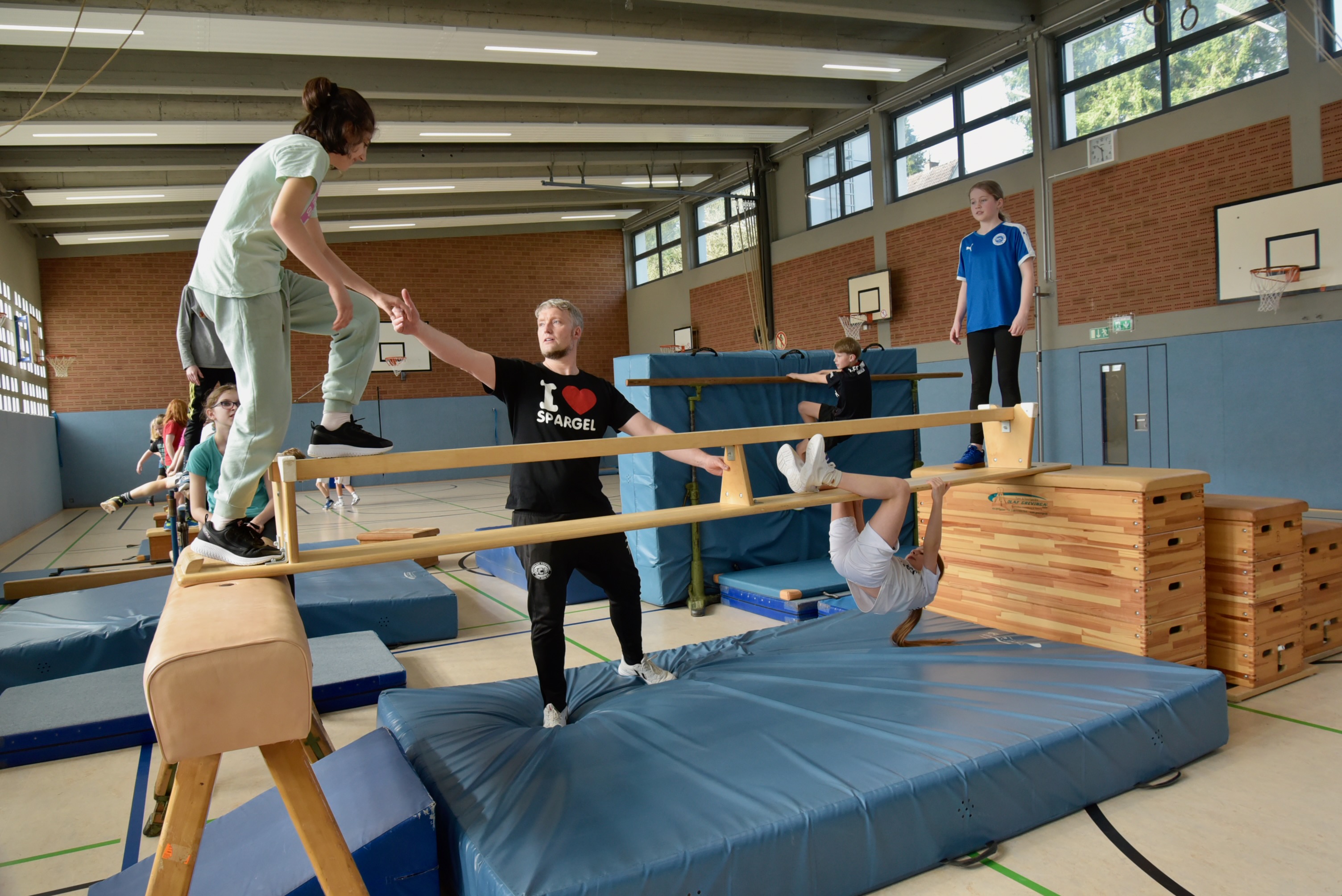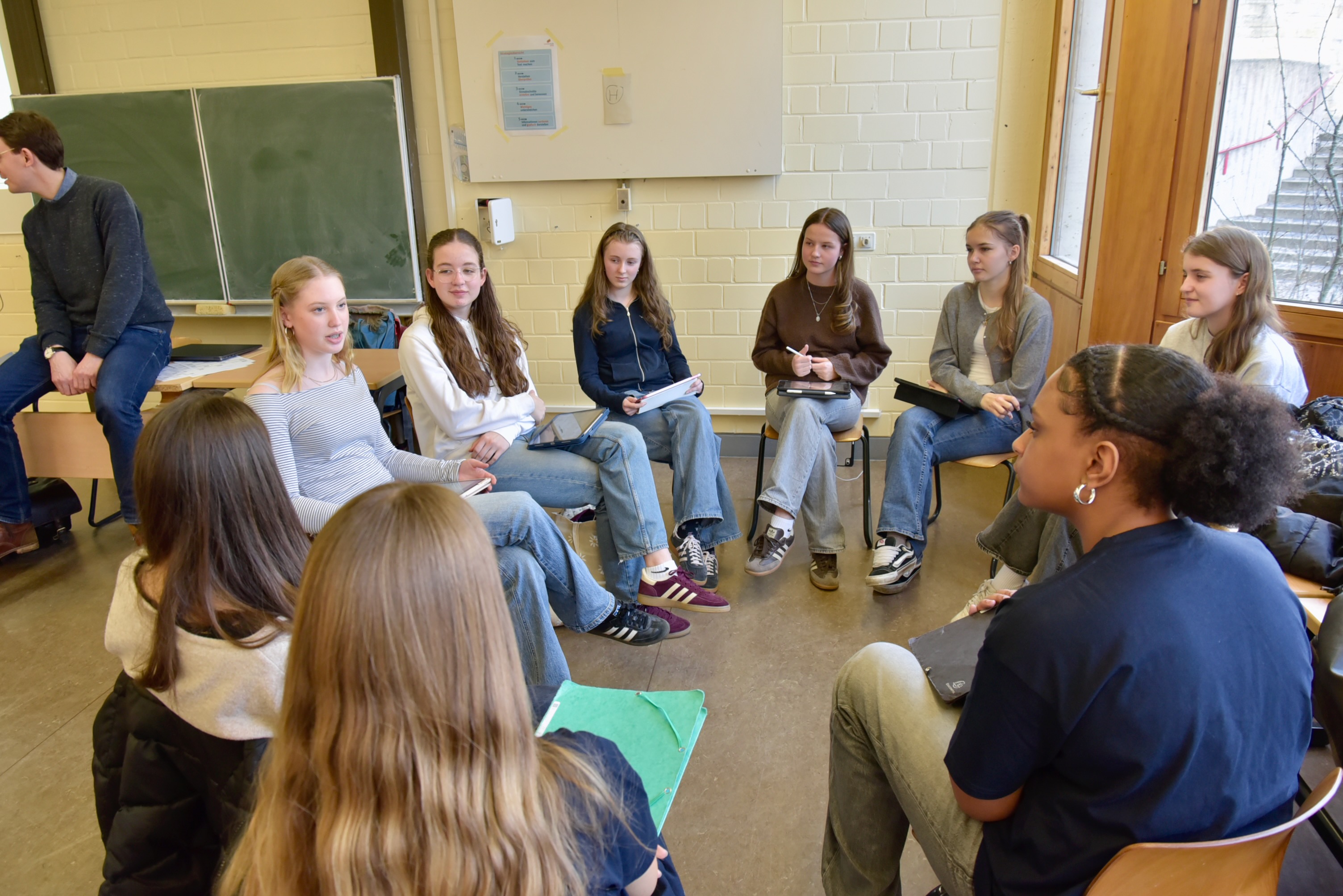 Die diesjährige Partnerschaftsgruppe umfasste 42 „corres“ von Deutsch- und Französischlernenden: Beide Seiten lernten sich bereits in Chalonnes kennen, und daher waren die Jugendlichen bereits mit Aspekten ihrer deutschen Partnerfamilien vertraut, das sie nun über eine Woche ‚live‘ miterleben sollten. Seitens des Collège waren es wieder Anne-Sophie Renoust, Bernadette Dilé-Abelard und Nelly Furst, die sie begleiteten. Die GAG-Französischfachschaft, vertreten durch Anja Weitkamp, Katharina Thiel, Sebastian Salk und Natalie Mousset, hatte das Austausch- und Jubiläumsprogramm mitgestaltet, flankiert durch viele Kollegiumsmitglieder, die interessante Einzelbausteine erdacht und umgesetzt haben. Hier ist vor allem das Potpourri kreativer Ideen zu nennen, das von Kunstlehrerin Lisa Volkamer im Rahmen des Jubiläumsgedankens initiiert wurde: Ein längerfristig im Rahmen von Projektarbeit angelegtes deutsch-französisches Comic-Projekt ist in der Pausenhalle ausgestellt, eine Dokumentation ihrer Fotos zum Jubiläumsgeschehen ist im GAG-Intranet (iserv) abrufbar.