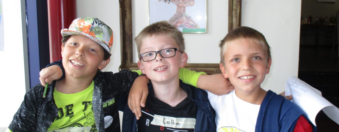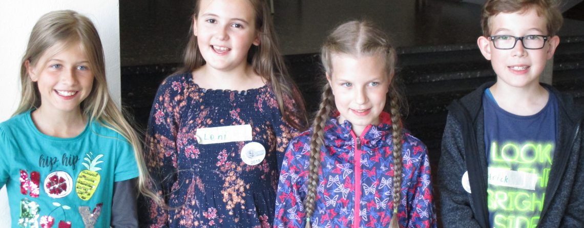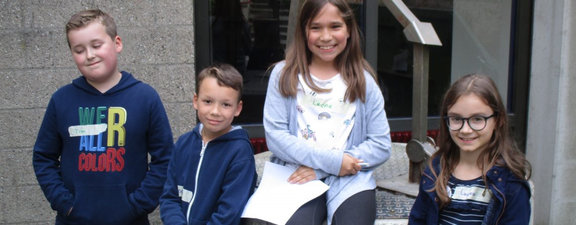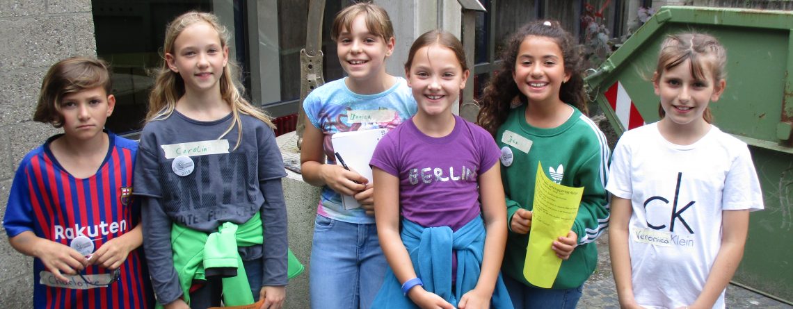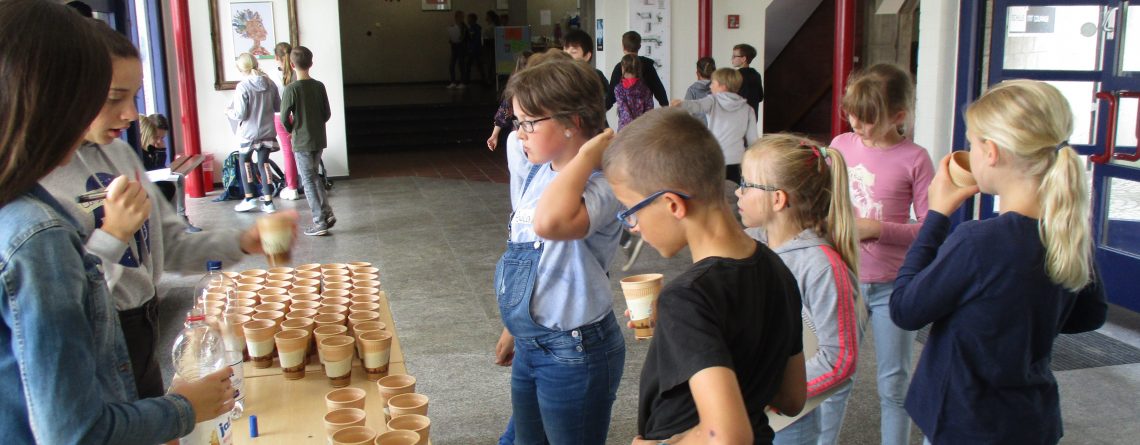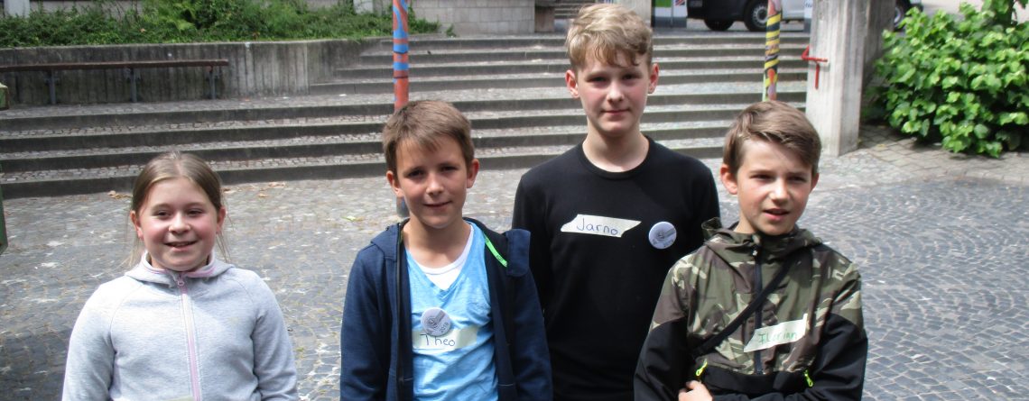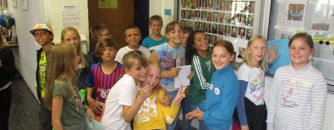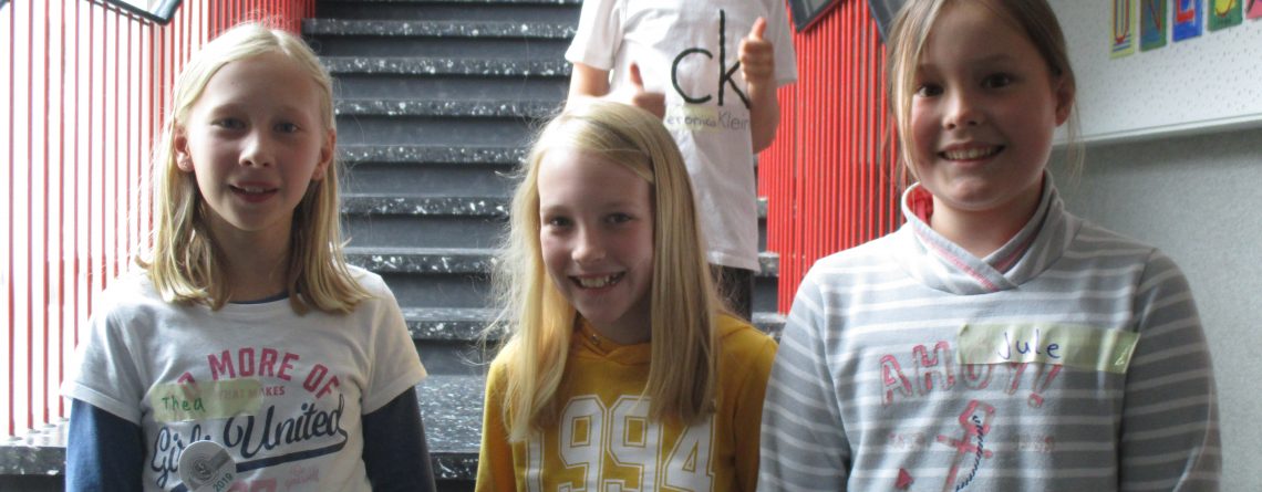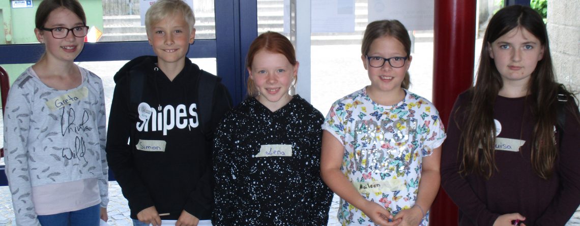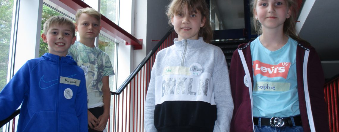 Dem gemeinsamen Auftakt und Jahrgangsstufenbild auf dem Schulhof folgte ein Kennenlernen auf Klassenebene, ehe die kommenden Fünftklässlerinnen und Fünftklässler in Kleingruppen die neue Schule bei einer Rallye erkundet haben. Als Snack-Stopp zwischendurch reichten ihnen Jarno und Viktoria (für die 5a), Nils, Sophia, Sophie (für die 5b) sowie Bjarne, Caroline und Lea (für die 5c) als Patinnen und Paten Getränke und Bananen. Die haben die Viertklässlerinnen und Viertklässler aber nur mit Hilfe einiger Schülerinnen und Schüler verputzt, die noch Nachmittagsunterricht hatten. Lotta als weitere Patin der 5a fehlte leider krankheitsbedingt.