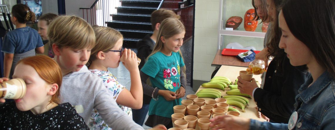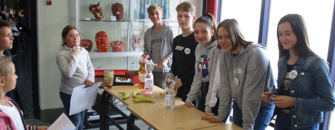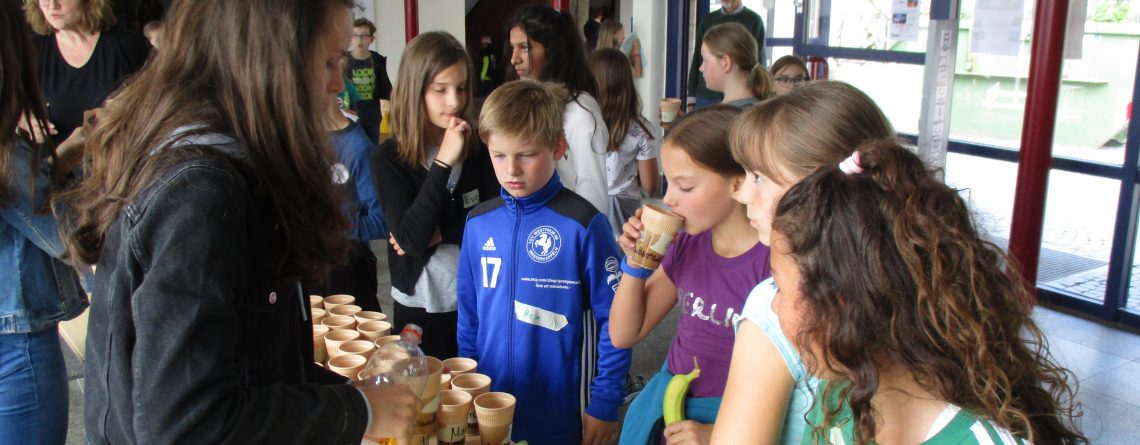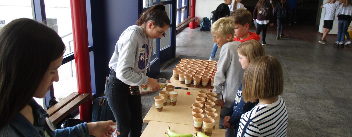 72 Mädchen und Jungen, die die kommende Jahrgangsstufe 5 besuchen werden, zehn Kilo Bananen, zwölf Liter Wasser und Apfelschorle sowie neun Klassenpatinnen und -paten waren einige der Zutaten für einen kurzweiligen Kennenlernnachmittag einige Tage vor den Sommerferien. Die kommenden Klassenleitungen des fünften Jahrgangs im Schuljahr 2019/20 in Form von Thomas Potthoff (5c) sowie dem Erprobungsstufenteam Wibke Schmitzdorff (5b) und Björn Igelbrink (5a) begrüßten die Kinder herzlich in der Schulaula. Hier lernten die Mädchen und Jungen ihre Klassenpatinnen und -paten kennen, die demnächst die Jahrgangsstufe 9 besuchen werden.