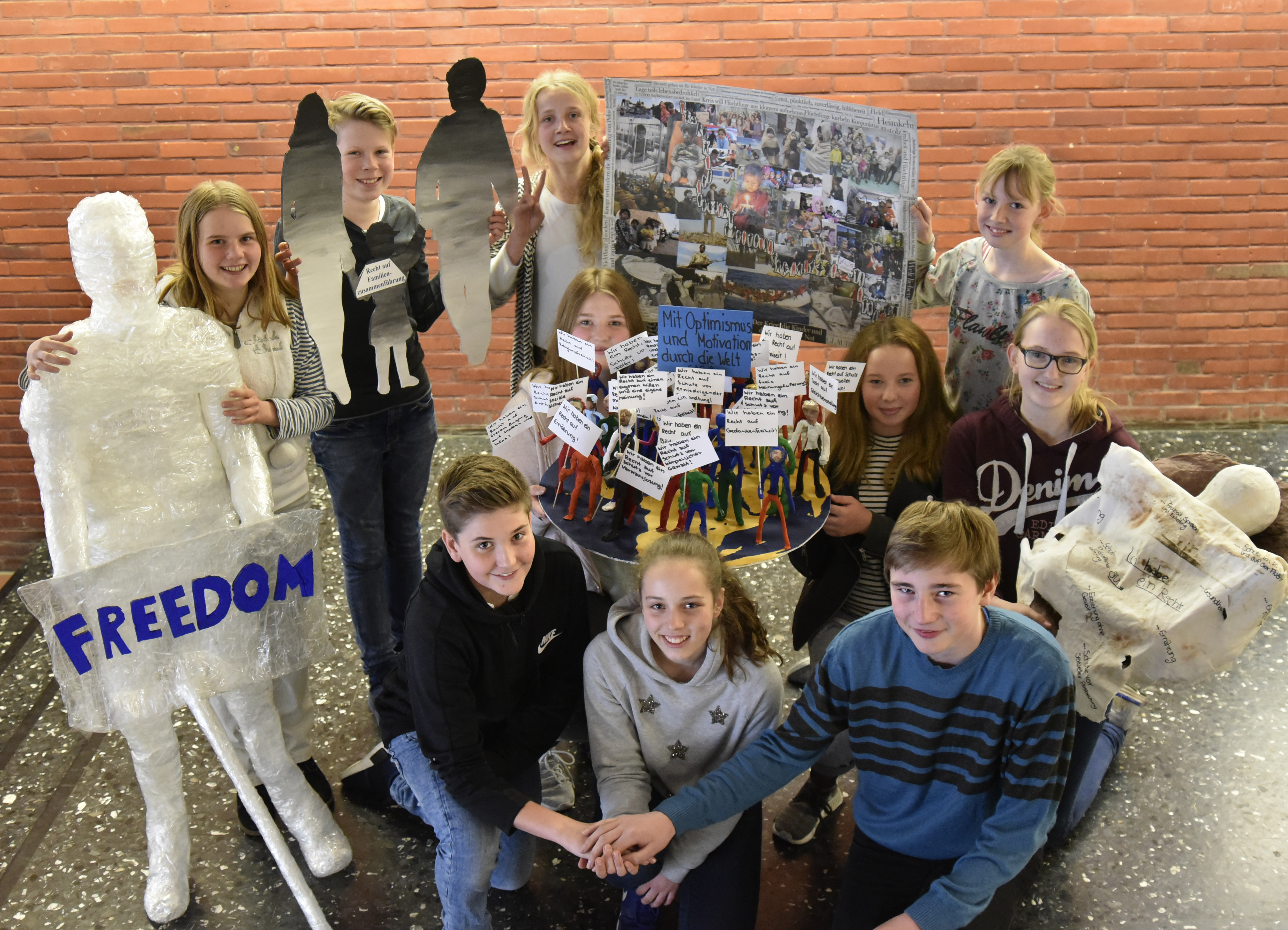 Schülerinnen, Schüler, Lehrkräfte und Schulleitung waren sich vor einem halben Jahr darüber einig: Der Umgang mit Kinderrechten sollte in den Blickpunkt der öffentlichen Diskussion geraten. Die Bilder von flüchtenden und hungernden Kindern und Jugendlichen in den Medien haben die Schulgemeinschaft des Graf-Adolf-Gymnasiums veranlasst, als UNESCO-Schule eine schulübergreifende Kunstaustellung mit dem Titel „Kinder haben Recht“ ins Leben zu rufen. So luden die Kunstfachschaft und die Schulleitung des Graf-Adolf-Gymnasiums andere Schulen dazu ein, sich an der Ausstellung zu beteiligen, damit ein vielgestaltiges Mosaik in der Auseinandersetzung mit Kinderrechten, deren Einhaltung sowie dem Verstoß gegen diese entstehen möge. Welchen besonderen Schutz genießen Kinder? Ist es gerecht, dass manche Kinder hungern müssen und andere nicht? Was sagen die Kinderrechte dazu? Haben unbegleitete Minderjährige auf der Flucht das Recht, in der neuen Heimat einen Antrag auf Familienzusammenführung zu stellen? Was kann gegen Gewalt gegenüber Kindern getan werden? Was können Kinder, Jugendliche und Erwachsene zur Einhaltung der Kinderrechte tun? Mit diesen und zahlreichen anderen Fragen haben sich in den vergangenen Wochen Schülerinnen und Schüler vieler verschiedener Schulen und verschiedenen Alters von vier bis achtzehn Jahren beschäftigt. So freuen sich Kunstfachschaft und Schulleiterin des Graf-Adolf-Gymnasiums Evelyn Futterknecht sehr darüber, das insgesamt acht Schulen und ein Kindergarten an der Ausstellung mitwirken. Neben der mitveranstaltenden Schule, dem Hannah-Arendt-Gymnasium Lengerich, das als langjährige Kooperationsschule des Graf-Adolf-Gymnasiums unmittelbar als Ausstellungspartner fungiert, ist auch die Bodelschwingh-Realschule Lengerich, das Geschwister-Scholl-Gymnasium Münster, die verschiedenen Grundschulen, die unter dem Dach der Teutoburger-Wald-Schule versammelt sind, sowie der Kindergarten des Familienzentrums Brochterbeck mit von der Partie.