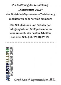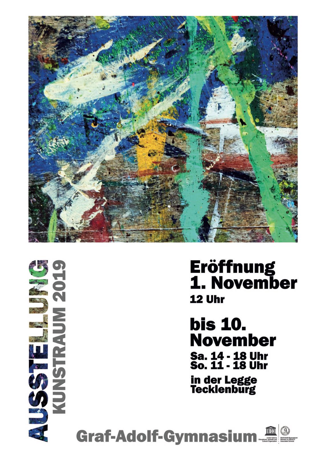 Das Graf-Adolf-Gymnasium präsentiert wieder einmal in seiner Ausstellung KUNSTRAUM 2019 in der Tecklenburger Legge vom 1. bis zum 10. November 2019 eine Auswahl der besten Arbeiten im Fach Kunst aus dem Schuljahr 2018/18. Sehr gelungene Arbeiten aus allen Jahrgangsstufen zeigen die Vielfalt der Themen und Techniken im Kunstunterrichts. Zur Eröffnung am Freitag, den 1. November um 12 Uhr sind alle Interessierten herzlich eingeladen.