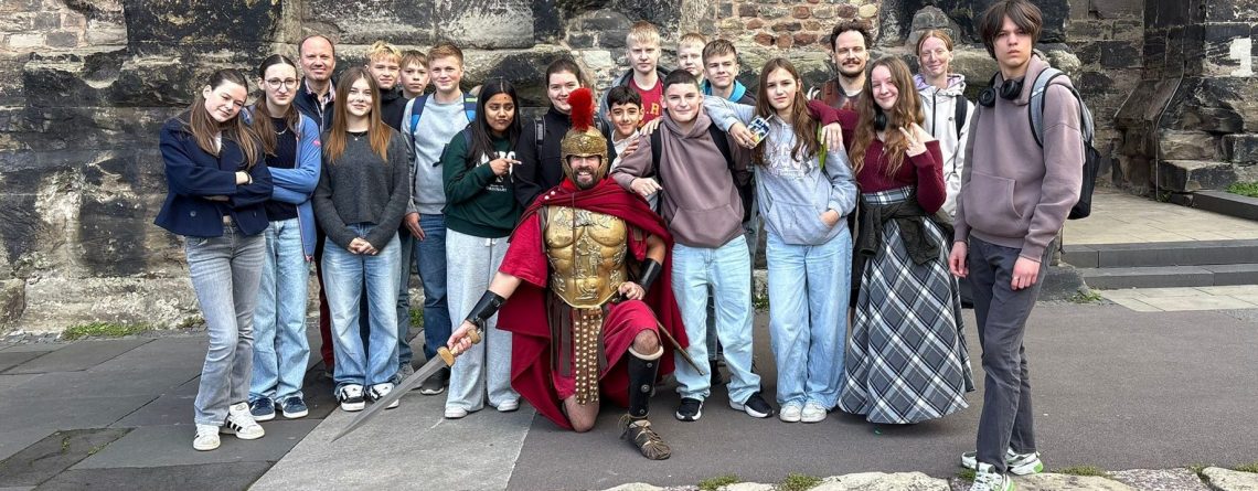 Das Programm war zuvor im Lateinunterricht geplant worden mit Kurzreferaten über die Trier-Klassiker Porta Nigra, die Kaiserthermen, das Amphitheater und die Römerbrücke. „Trier macht den Jugendlichen die Auseinandersetzung mit den Römern noch einmal auf ganz besondere Weise greifbar und dadurch auch für das Lateinlernen, das ja auch über die Jahrhunderte hinweg relevant geblieben ist. In diesem Jahr ist uns zudem noch ein „echter“ Zenturio begegnet, der gleich mit auf das Gruppenfoto kam“, so bilanziert Stroff begeistert die Entdeckungen vor Ort. Auch die Konstantin-Basilika, heute eine evangelische Kirche, war ursprünglich ein römischer Ort, nämlich die Palastaula. Mittelalterliches Vermächtnis in Trier ist die Hohe Domkirche St. Peter, und schließlich setzt die Stadt mit dem Karl-Marx-Haus und seiner 2018 errichteten Karl-Marx-Statue einen interessanten neuzeitlichen Akzent.