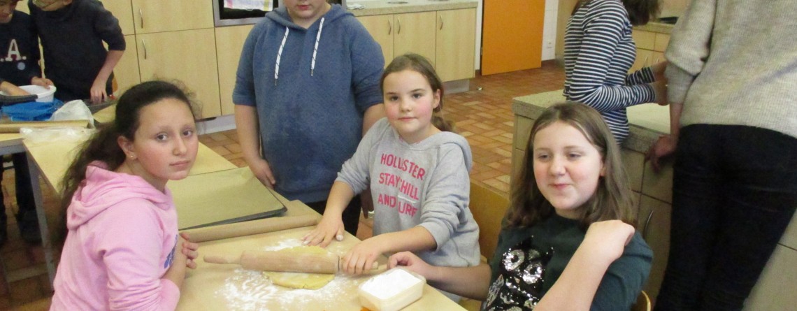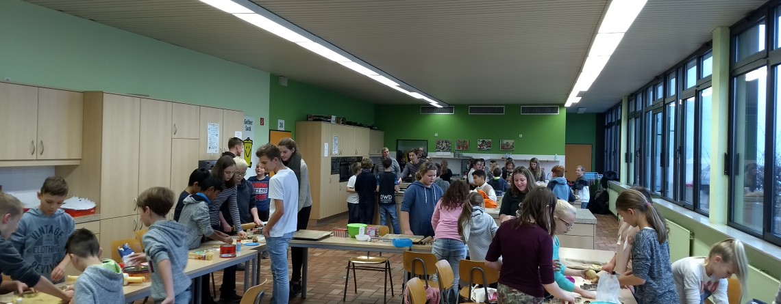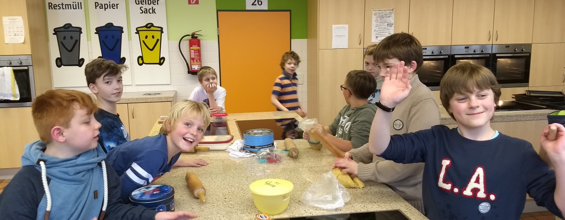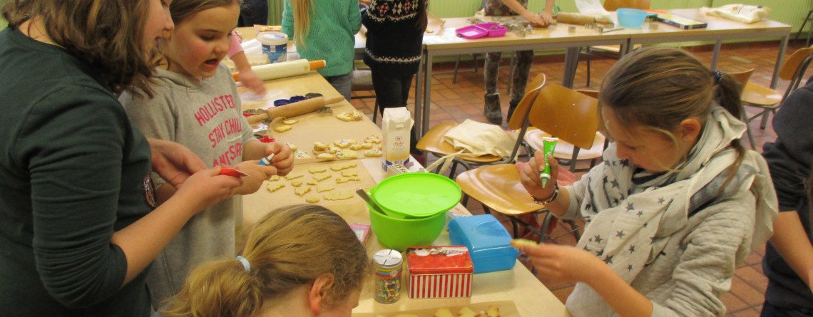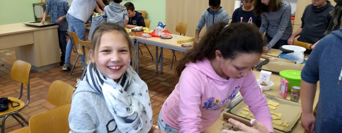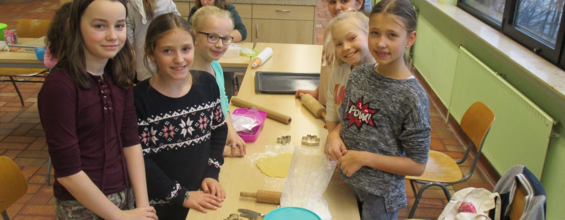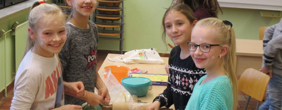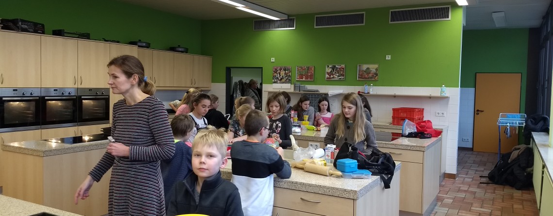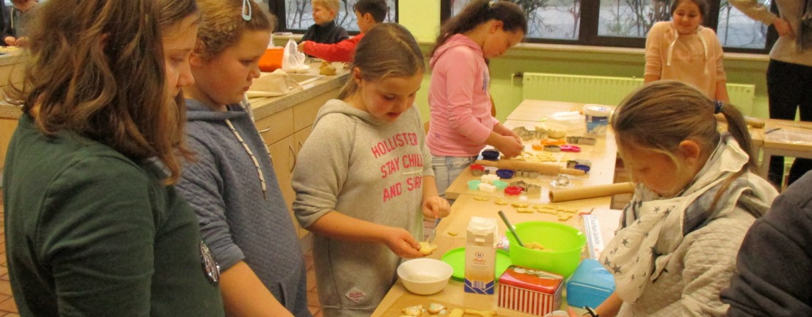 In eine Weihnachtsbäckerei verwandelten die Klassen 5a und 5b des GAGs die Küche der Hauptschule Tecklenburg. Fünf Öfen, 200 Grad Celsius und 50 Mädchen und Jungen sorgten mit ihren Klassenpatinnen und -paten dort weniger für eine riesengroße Kleckerei, sondern für so manche Leckerei. In kleinen Gruppen verteilten sie Mehl und rollten den Teig an den Kochinseln aus. Flugs waren die Förmchen im Einsatz und Marzipan-, Schokoladen- oder Mürbeteig verwandelte sich in Schneemänner, Glocken, Sterne, Elche, Zuckerstangen oder bunt dekorierte Plätzchen. Die Patinnen und Paten hatten mit den Klassenleitungen Björn Igelbrink, Jutta Mühge-Klepsch, Kerstin Riethues und Tobias Sechelmann die Öfen im Blick, nichts brannte an. Die fertigen Weihnachtskekse wurden noch mit Kakaopulver, Zuckerguss, Streuseln oder Schokolade garniert. Die Spezialitäten konnten die Schülerinnen und Schüler mit nach Hause nehmen. Einige boten die Köstlichkeiten ihren Lehrerinnen und Lehrern an, die sich darüber sehr freuten.
