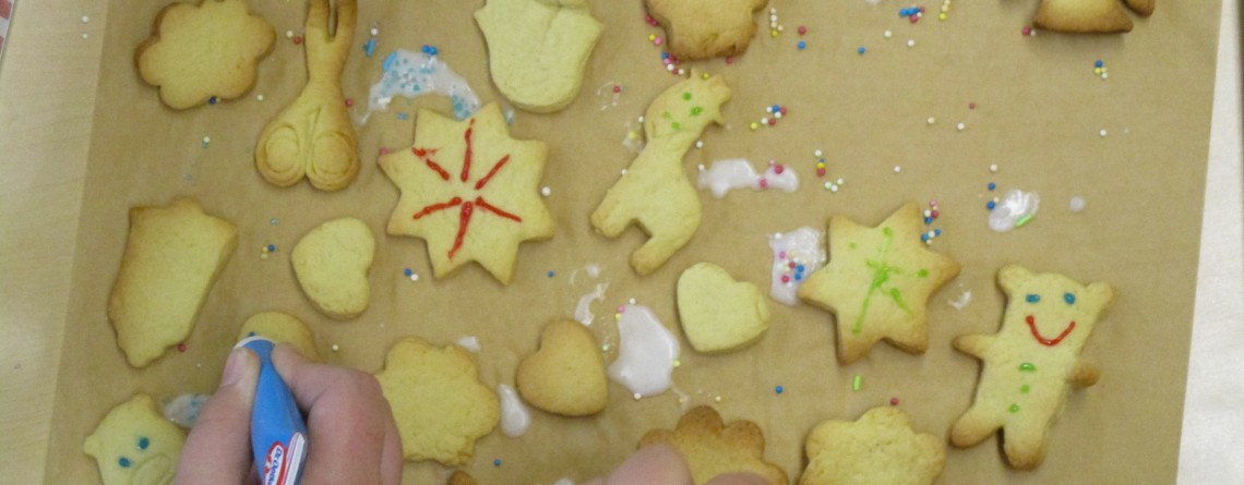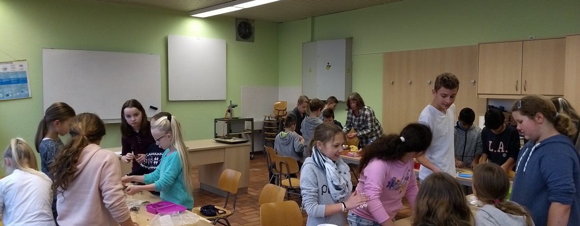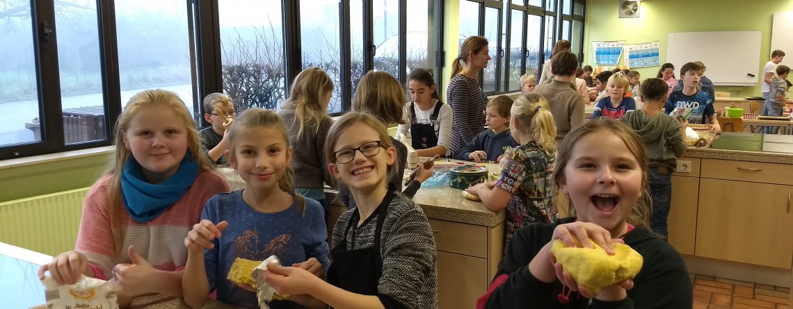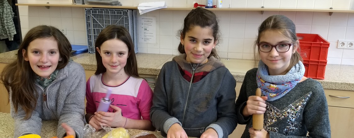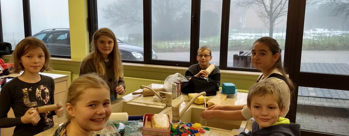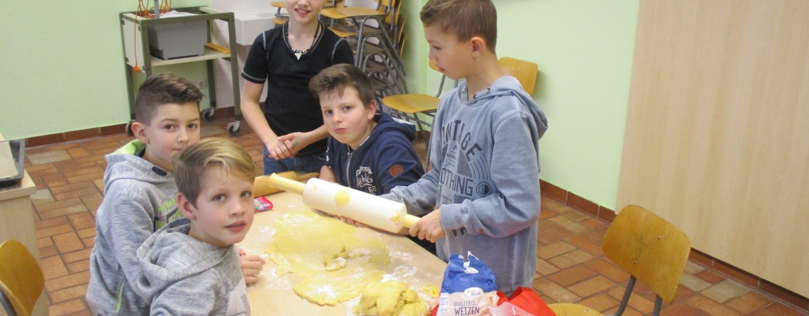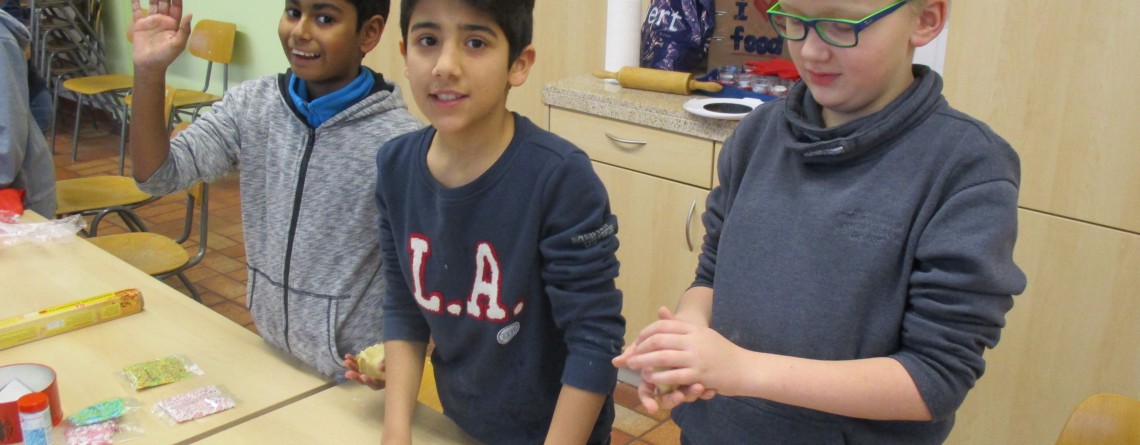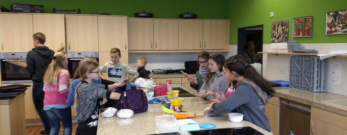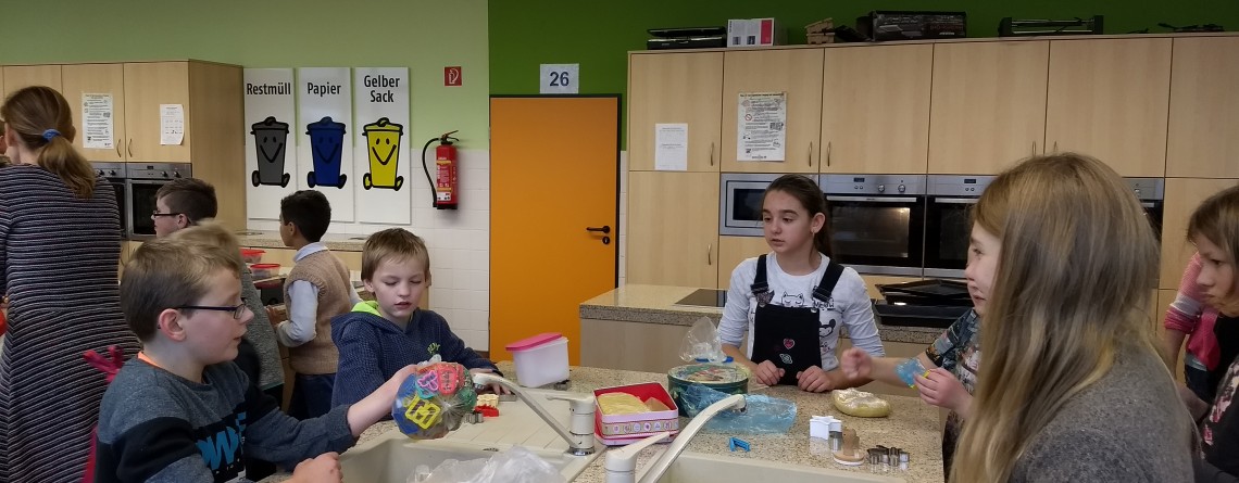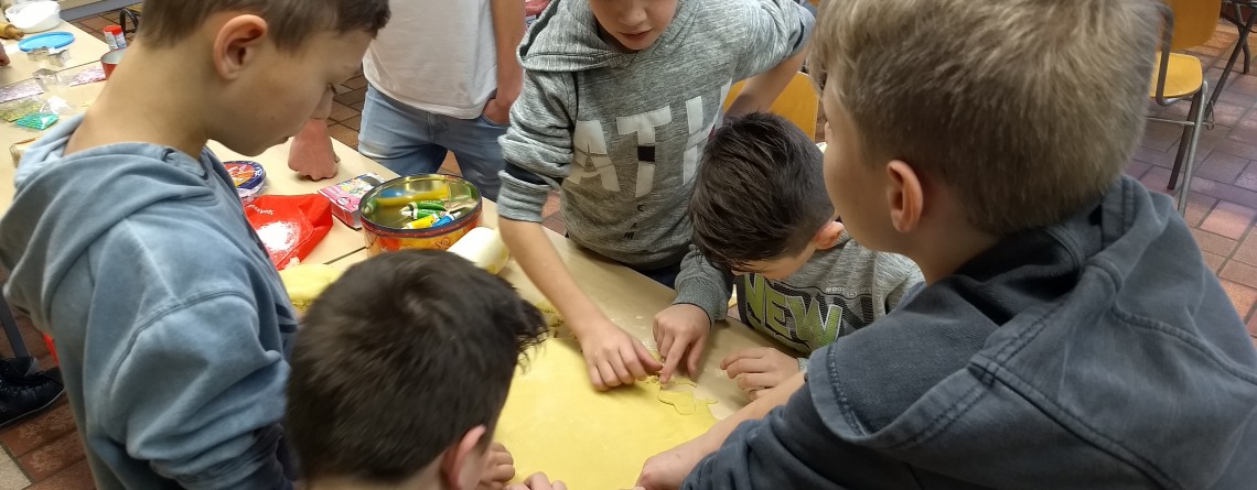 In eine Weihnachtsbäckerei verwandelten die Klassen 5a und 5b des GAGs die Küche der Hauptschule Tecklenburg. Fünf Öfen, 200 Grad Celsius und 50 Mädchen und Jungen sorgten mit ihren Klassenpatinnen und -paten dort weniger für eine riesengroße Kleckerei, sondern für so manche Leckerei. In kleinen Gruppen verteilten sie Mehl und rollten den Teig an den Kochinseln aus. Flugs waren die Förmchen im Einsatz und Marzipan-, Schokoladen- oder Mürbeteig verwandelte sich in Schneemänner, Glocken, Sterne, Elche, Zuckerstangen oder bunt dekorierte Plätzchen. Die Patinnen und Paten hatten mit den Klassenleitungen Björn Igelbrink, Jutta Mühge-Klepsch, Kerstin Riethues und Tobias Sechelmann die Öfen im Blick, nichts brannte an. Die fertigen Weihnachtskekse wurden noch mit Kakaopulver, Zuckerguss, Streuseln oder Schokolade garniert. Die Spezialitäten konnten die Schülerinnen und Schüler mit nach Hause nehmen. Einige boten die Köstlichkeiten ihren Lehrerinnen und Lehrern an, die sich darüber sehr freuten.