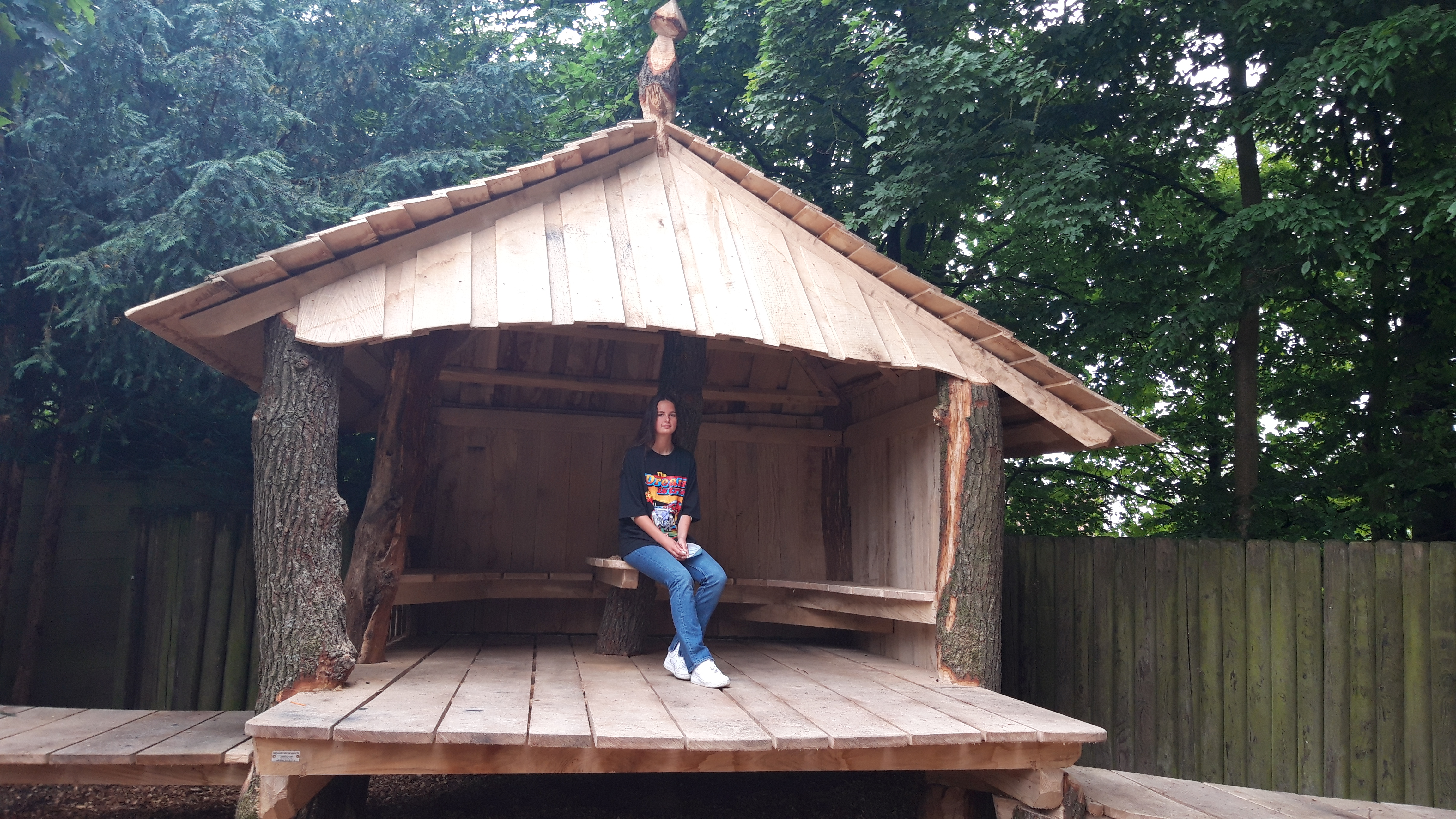 Sophia Müller-Bromley – nicht vor einem kanadischen Blockhaus sondern vor der neuen Blockhütte des Graf-Adolf-Gymnasiums