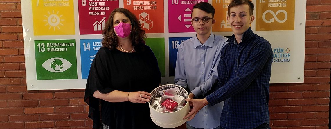Das übrige Preisgeld in Höhe von ca. 1100 Euro, das die Schüler*innen im Winter 2019 – vor dem hiesigen Ausbruch der Corona-Pandemie – im Rahmen der Verleihung des „Schüler*innenpreises für ausgezeichnete MINT-Projekte“ der Adelheid Windmöller-Stiftung erhielten, überreichten sie nun der UNESCO- und MINT-Schule in Form von IT-Sachspenden.
