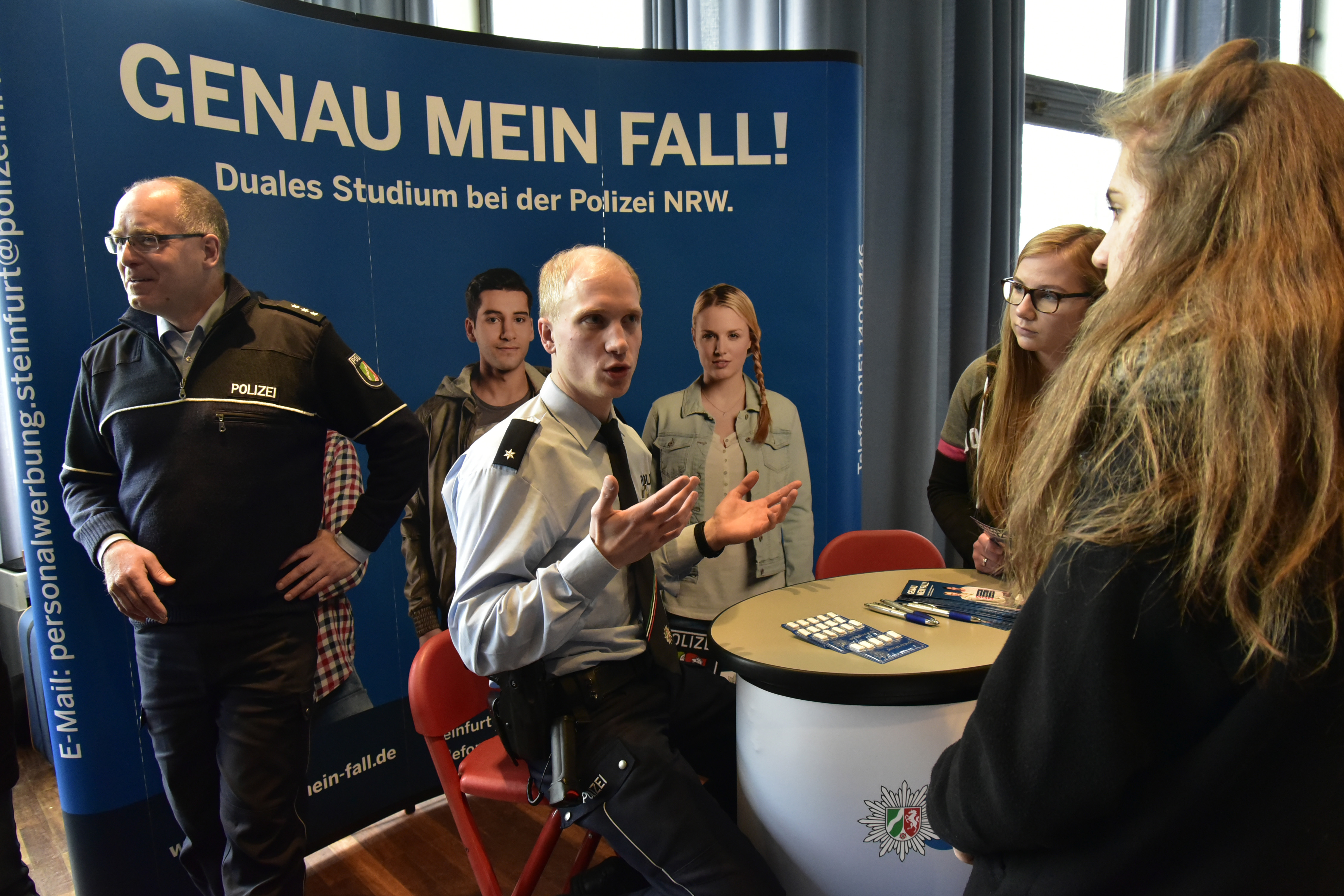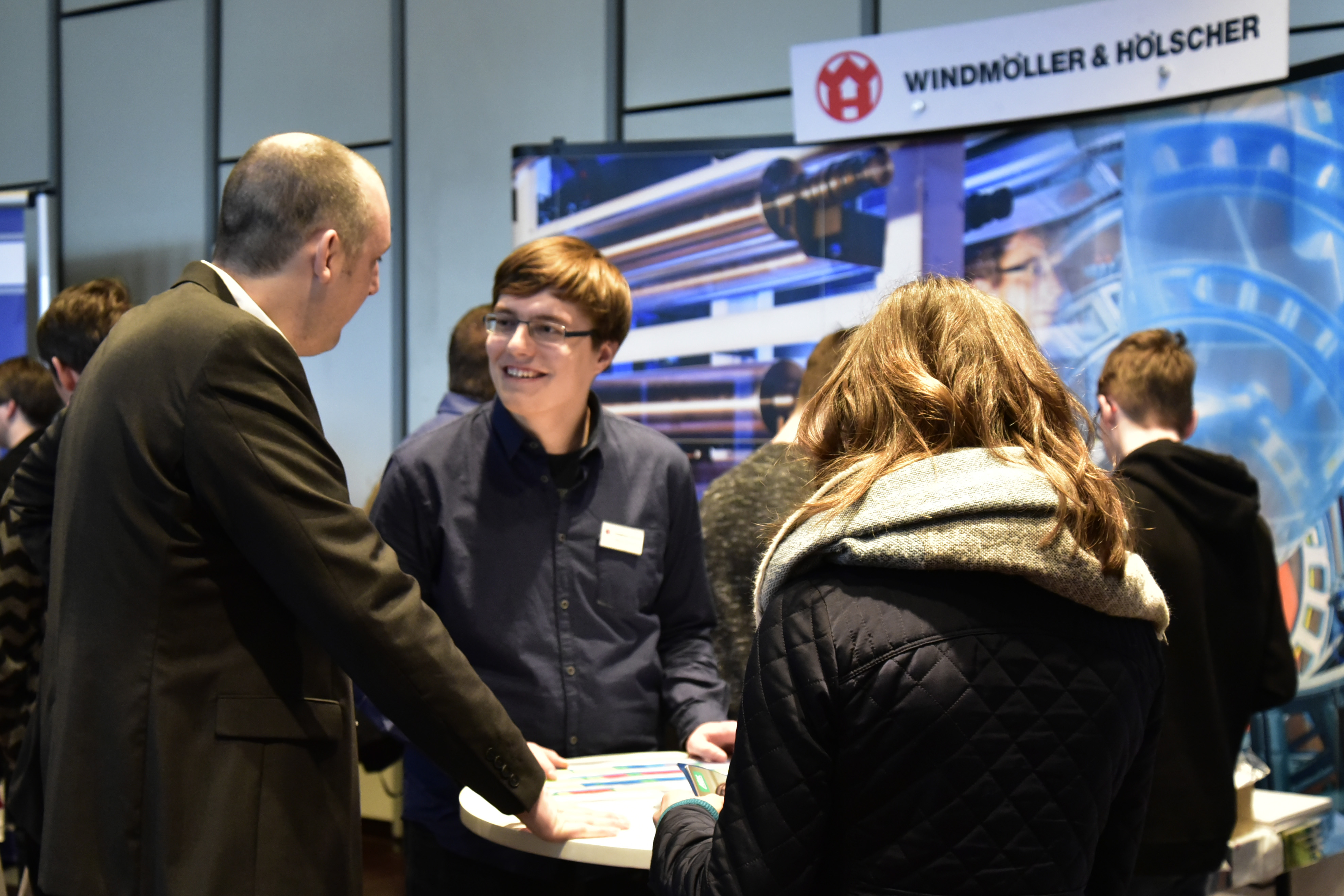 _DSC5295Die Unternehmen nutzen die Messe des Graf-Adolf-Gymnasiums, um sich zu präsentieren, aber auch um zu schauen, wer in den kommenden Monaten und Jahren mit Bewerbungen um Praktika, Ausbildungsstellen oder duale Studiengänge auf sie zukommen könnte. „Es ist gut, wenn man die Bewerber schon einmal gesehen hat“, weiß Jens Voß sive Gralmann. Der angehende Industriekaufmann macht den Schülern am Donnerstag seinen Ausbildungsbetrieb Bischof und Klein schmackhaft.