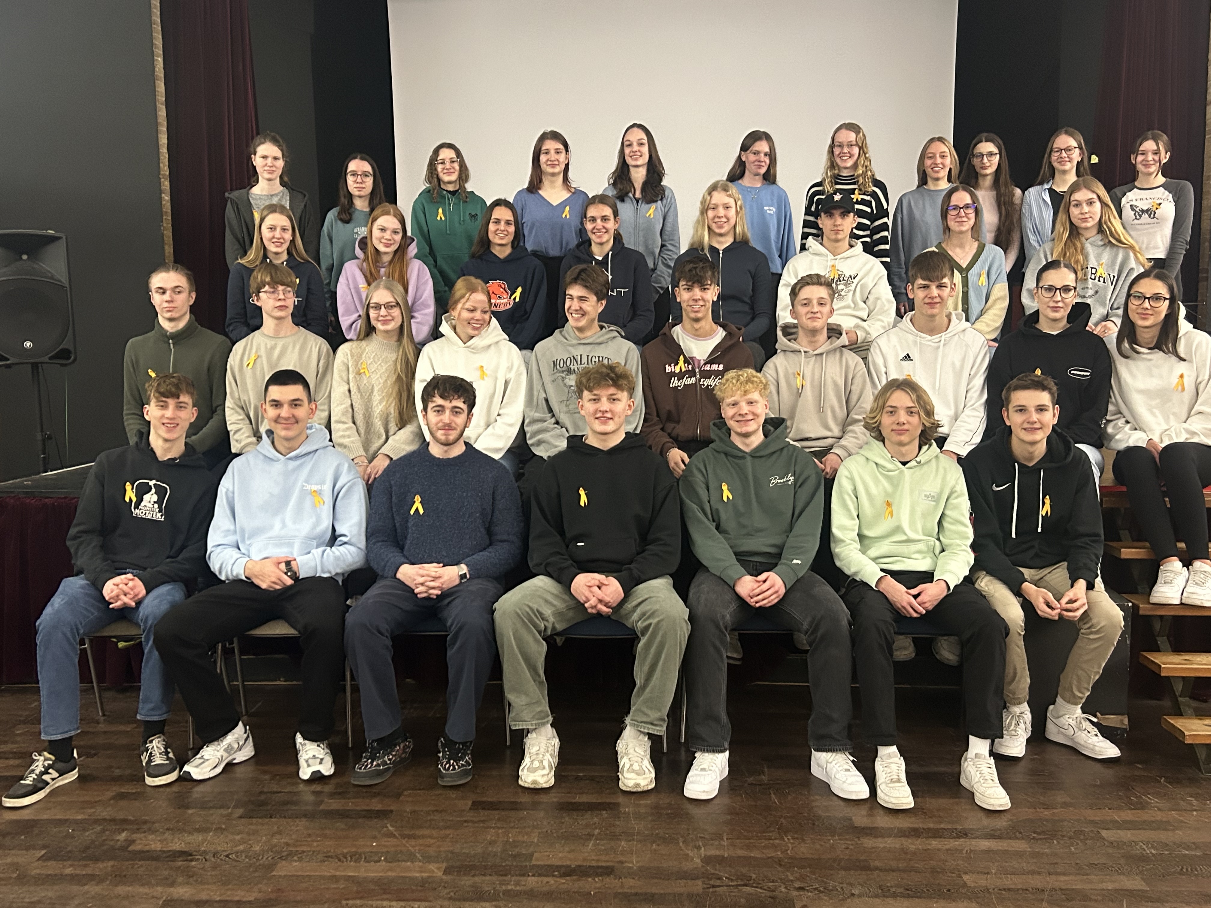 „Toll und ausgesprochen berührend ist“, so Mitinitiatorin Dr. Monika Höhl, wie stark sich die GAG-Schülerschaft und das Kollegium und insbesondere auch unser Abiturjahrgang mit der Idee und deren Umsetzung identifiziert und der Umsetzung ausgestaltet. Symbolisch für die gesamte Schule entstand daher auch ein sehr aussagestarkes “Abiturjahrgangsfoto mit Schleifen’, aufgenommen in der Aula.