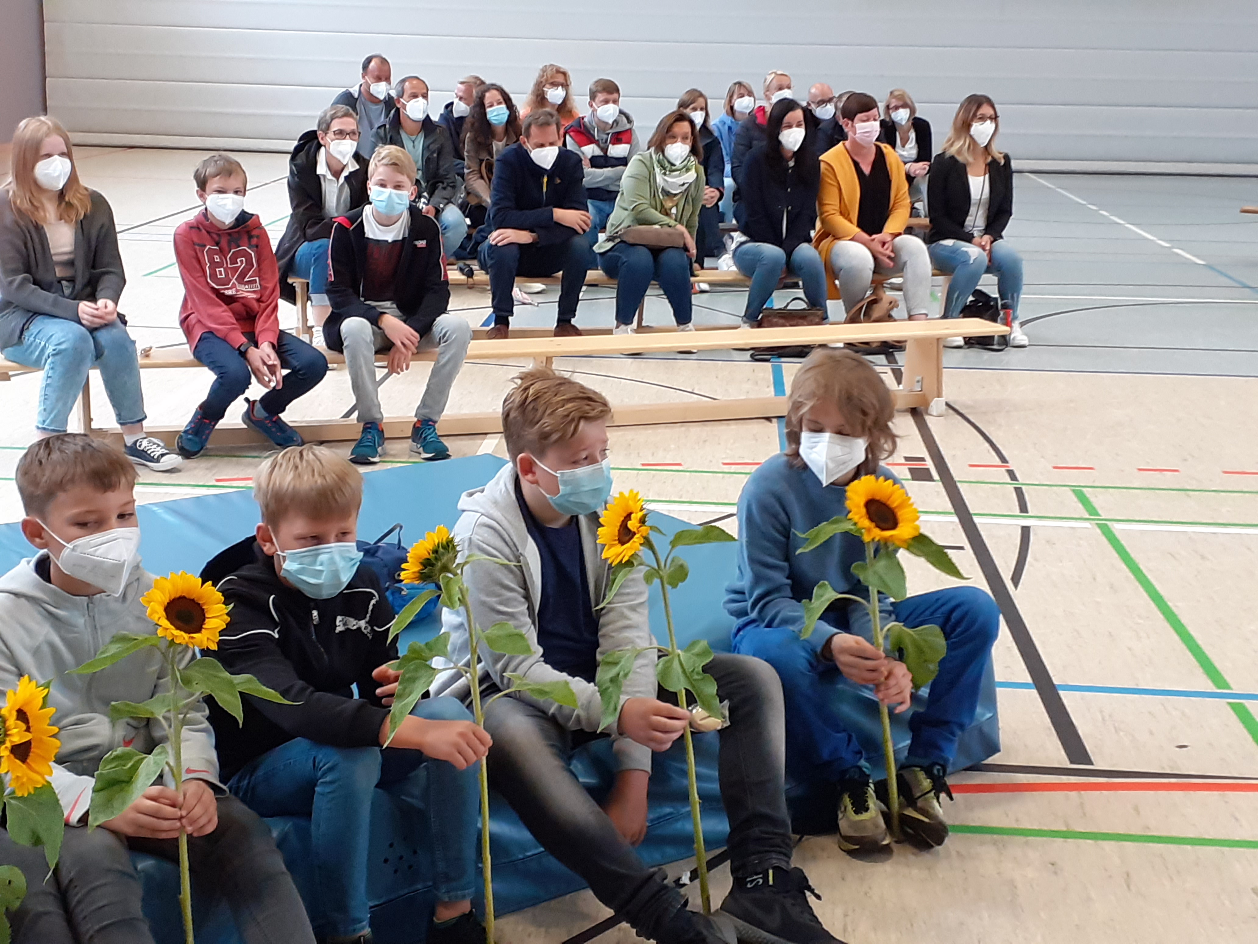 Mit Buttons und Sonnenblumen ging es für die drei Klassen des neuen fünften Jahrgangs dann noch zur dritten Station. Dort erwartete die Begleitungen und Kinder eine kleine Erfrischung sowie die druckfrische neue Ausgabe der GAG-Schulnachrichten. Kolleginnen und Kollegen standen zum Gespräch für die Begleitungen zur Verfügung, während die Kinder ihre Klassenräume kennenlernten und ihre Stundenpläne bekamen. Lisa Volkamer machte an der neuen Holzhütte auf dem kurz vor den Sommerferien umgestalteten Schulhof von allen Klassenfotos.