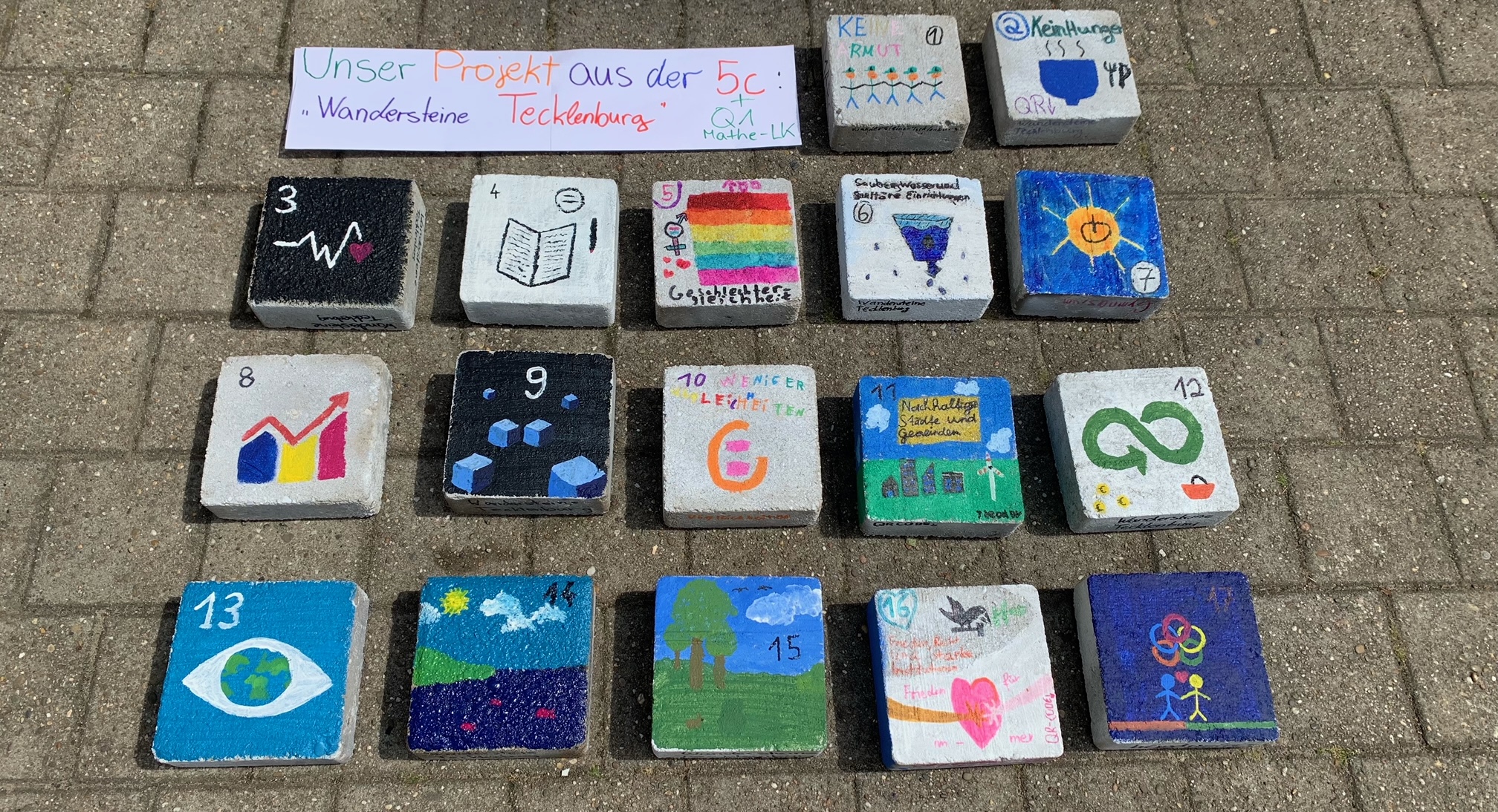 Kurz vor den Sommerferien wurden sie während der UNECO-Projekttage des Graf-Adolf-Gymnasiums phantasievoll gestaltet: Wandersteine, die unter anderem schon bis zur Ostsee gereist sind. Nun, zu Beginn des neuen Schuljahrs, haben schon einige der über 135 phantasievoll gestalteten Wandersteine, die dem GAG-Schulhof für das Projekt Lebens(t)raum entnommen wurden, recht entfernte Wanderziele erreicht. Zwei von ihnen erreichten Anfang August Neustadt in Holstein. Weitere wurden auf ihren Zwischenstationen bei Kassel (Vellmar), Ammeloe bei Vreden und in den Niederlanden entdeckt. Und andere sind weiterhin an den Standorten zwischen Tecklenburg, Lengerich und Ladbergen zu finden, an denen sie Anfang Juli von ihren Gestalter*innen aus der Klasse 5c und dem Mathematik-Leistungskurs der Jahrgangsstufe 11 (Q1) abgelegt wurden.