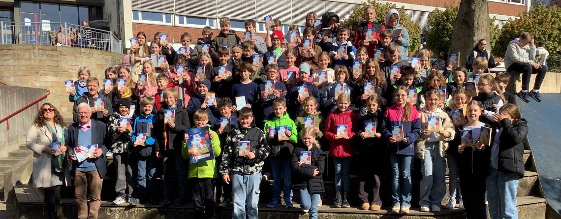 Zum Welttag des Buches begrüßte die UNESCO-Schule Wilhelm Kienemann von der Buchhandlung Howe, der die Bücher im Gepäck hatte. Schulleiterin Evelyn Futterknecht und Erprobungsstufenkoordinator Björn Igelbrink hießen ihn auf dem Schulhof herzlich willkommen. Wilhelm Kienemann überreichte allen Kindern der drei Klassen der GAG-Jahrgangsstufe 5 jeweils ein persönliches Exemplar von „Mission Roboter – Ein spannender Fall für die Glücksagentur“ von Anke Girod und mit Illustrationen von Timo Grubing. Im Rahmen der Aktion „Ich schenk dir eine Geschichte“ verteilte Kienemann die Bücher an die Kinder, wodurch das Interesse an Literatur in Kooperation mit dem Deutschunterricht gefördert werden kann.
