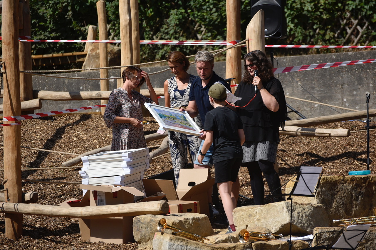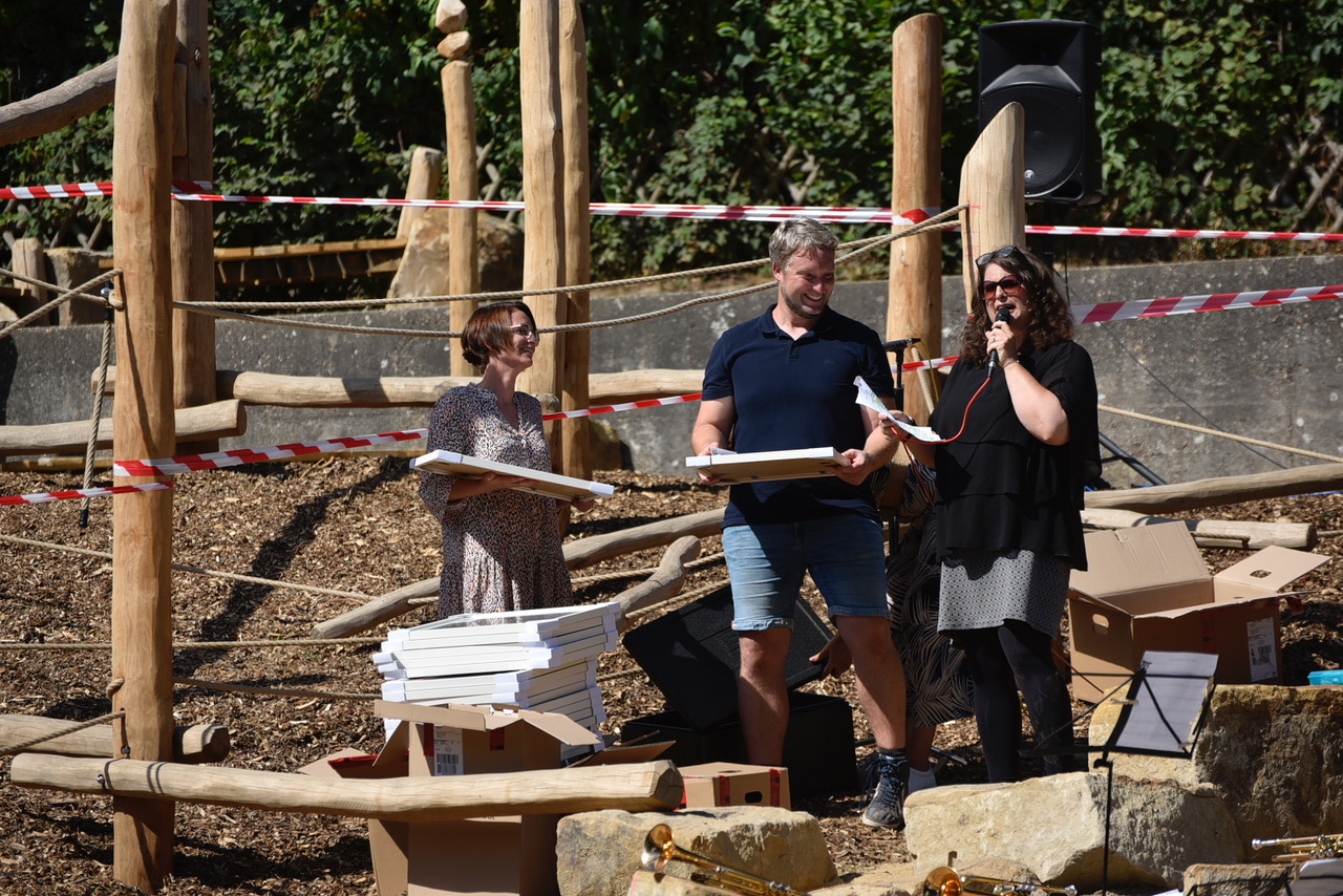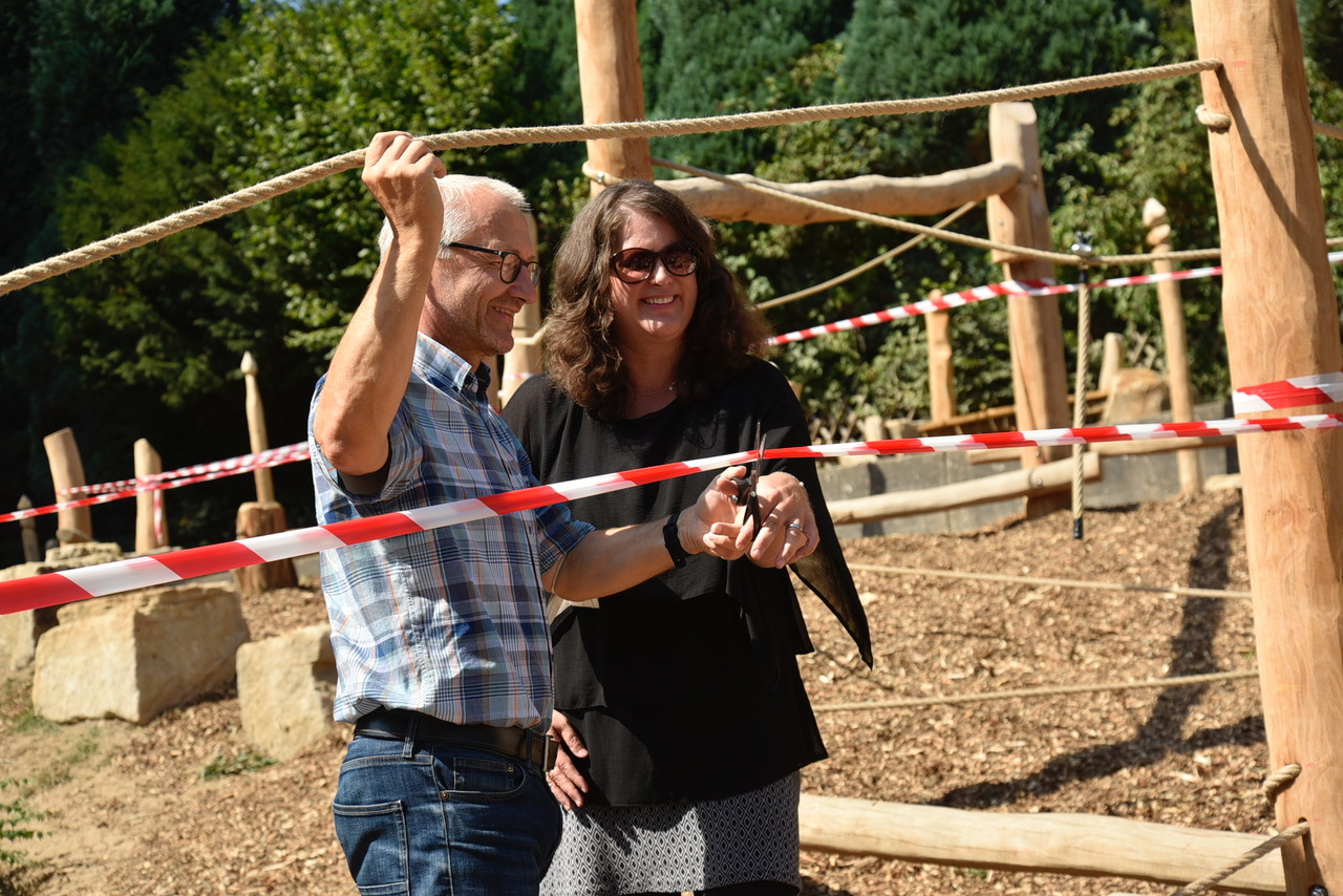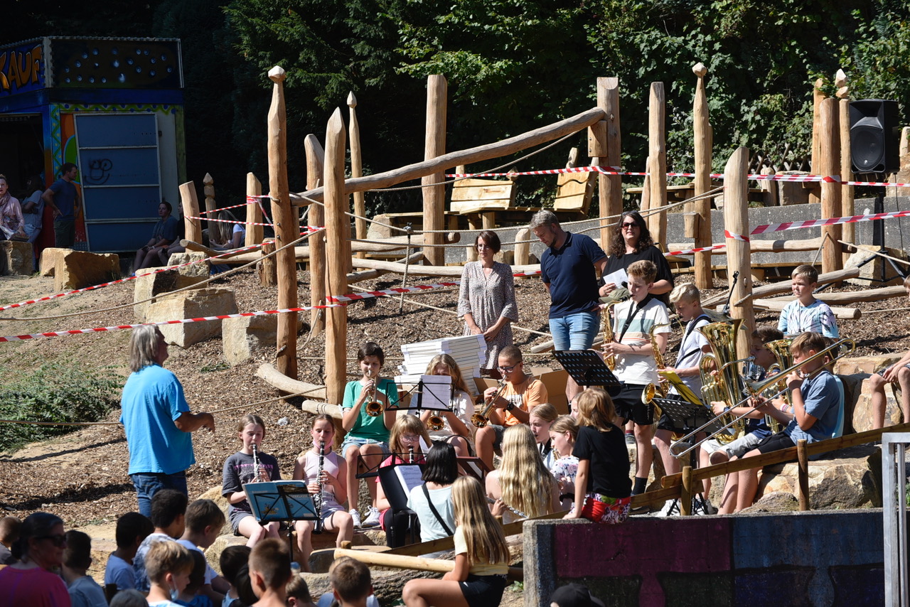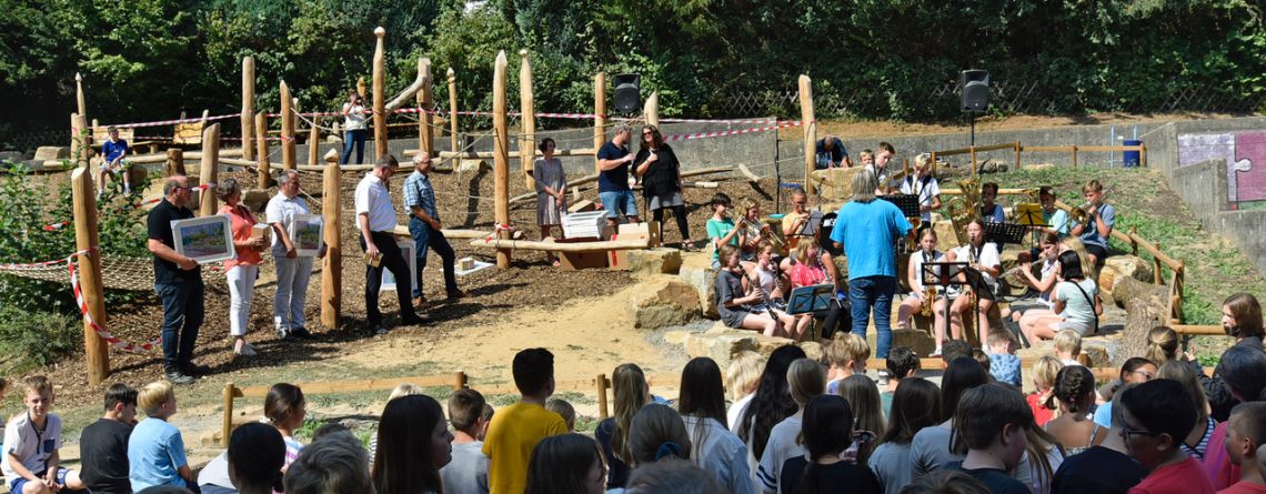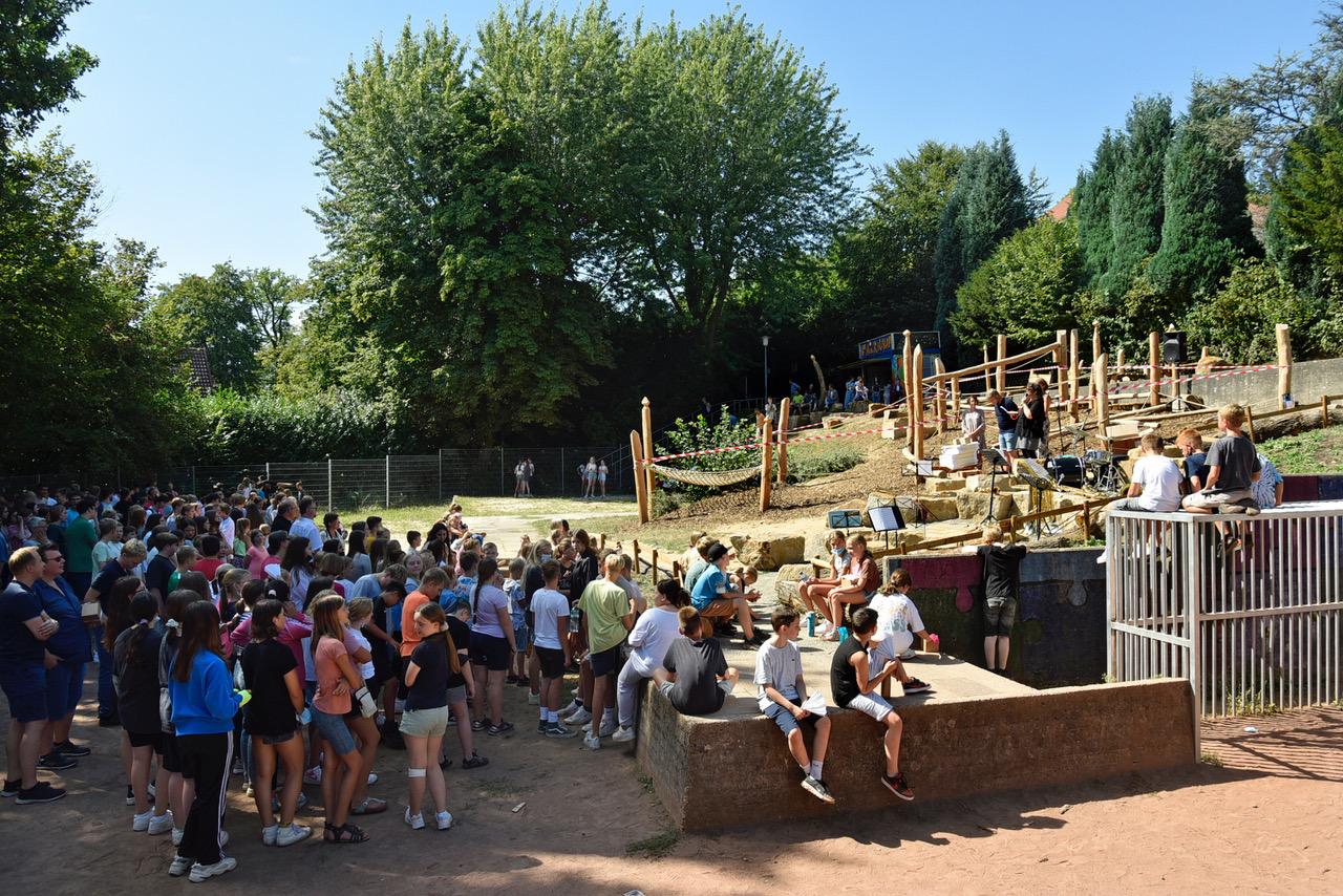 Um diesen Schulhof wird das Graf-Adolf-Gymnasium sicherlich von vielen beneidet: Naturnah, mit viel Holz und Grün, Kletter- und Sitzmöglichkeiten, einem Pavillon – und nun mit einem Niedrigseilgarten und Sandsteinklötzen zum Chillen und Klönen. Am Mittwoch, bevor die Schülerschaft in den hitzefreien Nachmittag entlassen wurden, kam sie zusammen, um die offizielle Eröffnung des zweiten Teilabschnitts zu feiern. Mit Live-Musik der Bläserklasse und einigen Gästen.