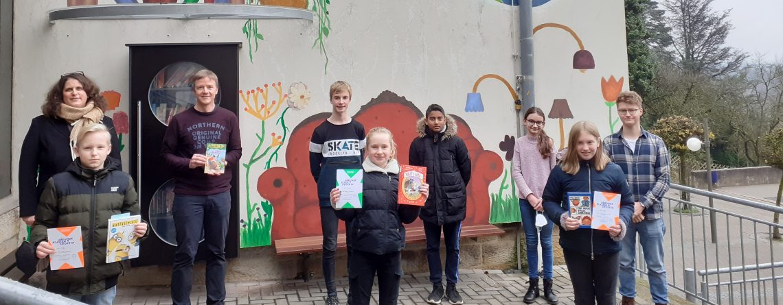 Foto: Die drei Schulentscheidteilnehmer*innen Laurin Hilge, Mona Brockfeld und Victoria Thrän (vorne von links nach rechts) stehen in der Leseecke am Bücherschrank auf dem GAG-Schulhof. Schulleiterin Evelyn Futterknecht (hinten links), Erprobungsstufenleiter Björn Igelbrink (hinten, zweiter von links) sowie die Jury freuen sich über ihre Vorlesetalente.