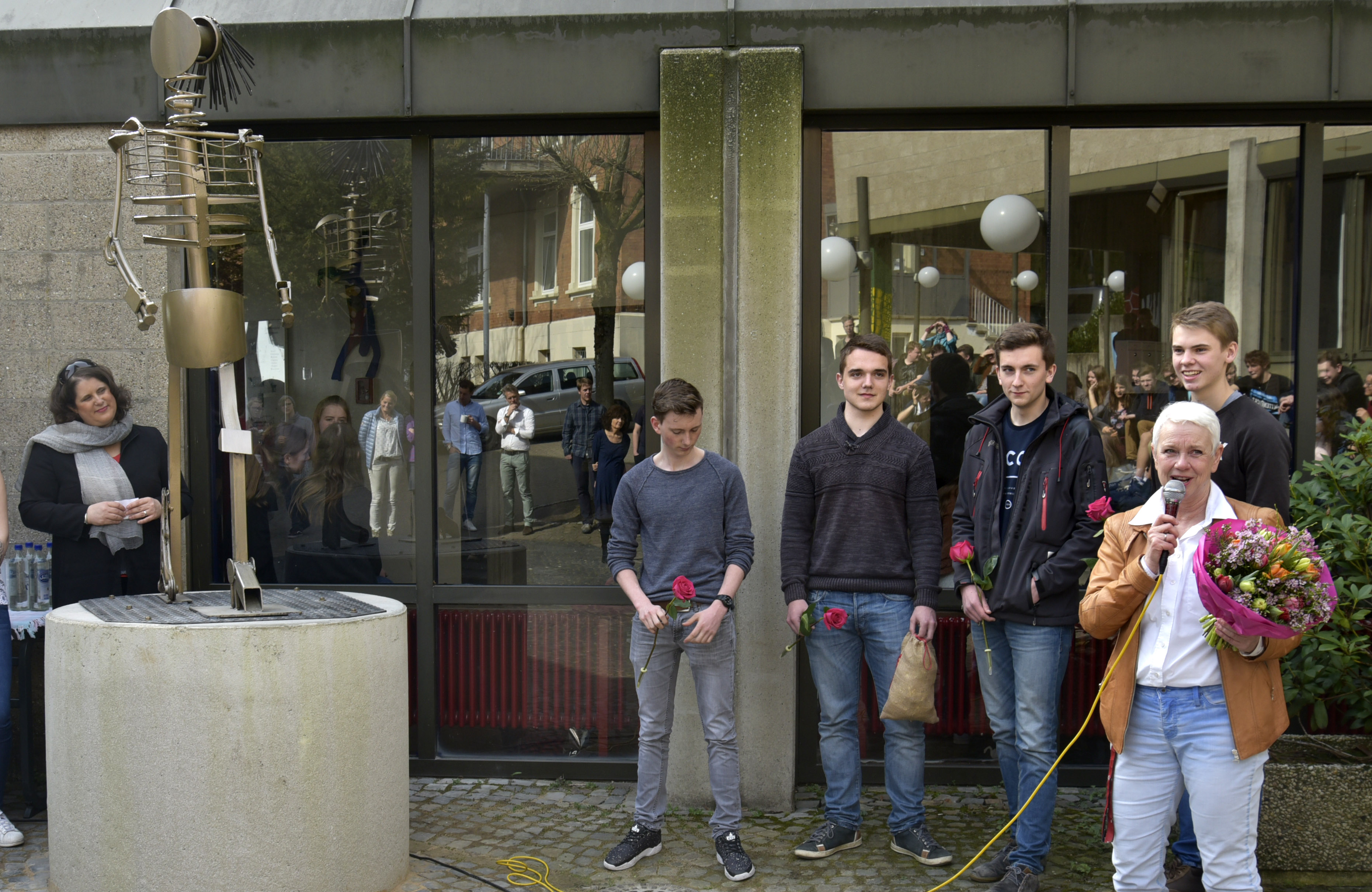 Eine überlebensgroße Metallskulptur eines schreitenden Menschen – für Kunstkenner subtil inspiriert durch Vorbilder der Etrusker oder aus dem Werk Alberto Giacomettis – steht seit Mittwoch letzter Woche auf einem mit wohlwollender Unterstützung der Stadt Tecklenburg installierten Rundsockel vor dem Graf-Adolf-Gymnasium. Geschaffen wurde sie in den letzten Monaten von einer sechsköpfigen Gruppe aus dem Kreis der diesjährigen Abiturientia, betreut von Kunst- und Philosophielehrerin Heidemarie Wenzel.