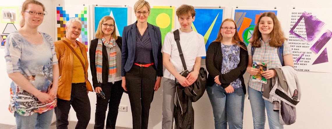 SchülerInnen mit Kunstlehrerin Heidemarie Wenzel, Künstlerin Michelle Adolfs und Ministerin Christina Kampmann (v. links)