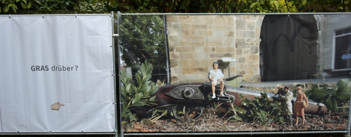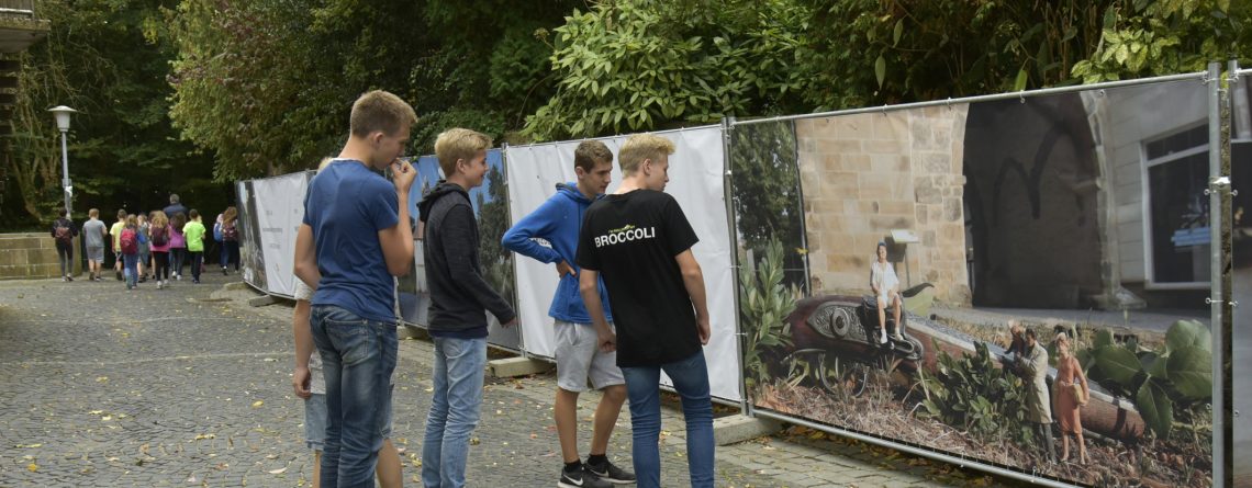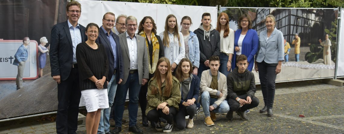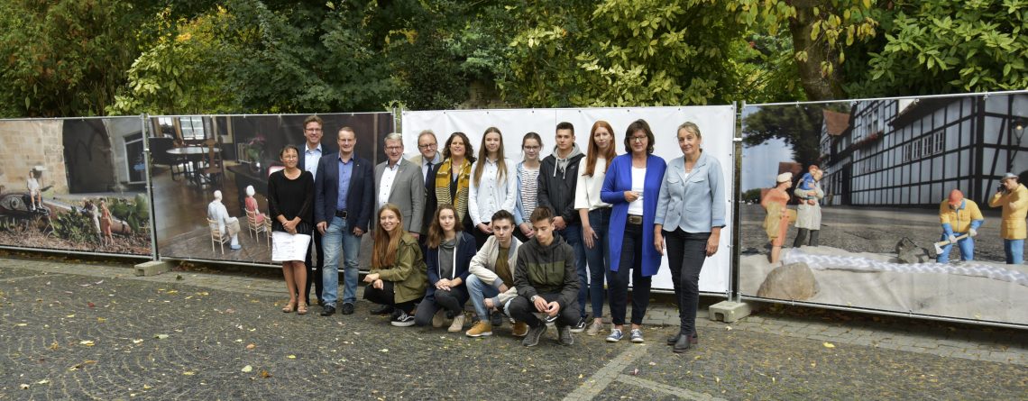 Plakatentwürfe, präsentiert auf Bauzäunen, haben Schülerinnen und Schüler des Graf-Adolf-Gymnasiums entwickelt. Mit Kunstpädagogin Lisa Volkamer, Foto-Künstlerin Simone Thieringer und Ellen Ortmann (von rechts) haben sie das Projekt umgesetzt. Lob gab es von VHS-Leiterin Angelika Weide, Superintendent André Ost, Bürgermeister Stefan Streit, Landrat Klaus Effing, Kirchenkreis-Kulturbeauftragter Norbert Ammermann und Schulleiterin Evelyn Futterknecht (hinten von links).