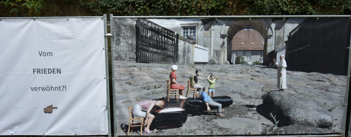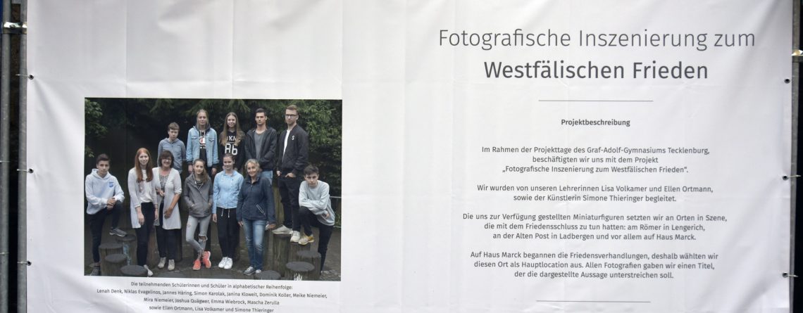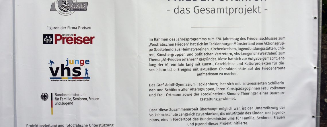 Anlass für die Aktion war der 375. Jahrestag des Verhandlungsbeginns zum Westfälischen Frieden auf Haus Marck. „Eröffnung am Weltfriedenstag“, wie VHS-Leiterin Angelika Weide feststellt. Superintendent André Ost sieht in dem Projekt einen „tollen Anstoß dafür, Begegnung in der Unterschiedlichkeit zu leben.“ Die Plakate mit den Botschaften sind gut einen Monat in Tecklenburg zu sehen.